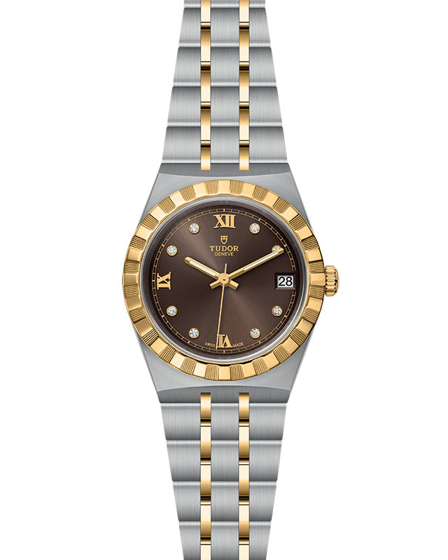 Maglie centrali in acciaio o acciaio rivestito da uno strato di oro giallo di 0,2 mm, Cassa in acciaio, 34 mm, finitura lucida e satinata, Color cioccolato con 8 diamanti, Corona di carica a vite con logo TUDOR. Acciaio rivestito da uno strato di oro giallo di 0,1 mm, Impermeabile fino a 100 m, Lunetta scanalata in oro giallo massiccio con scanalature e finitura lucida alternate, acciaio e oro, Movimento meccanico a carica automatica, Calibro T601, Quadrante colorato, Piccolo, Vetro zaffiro