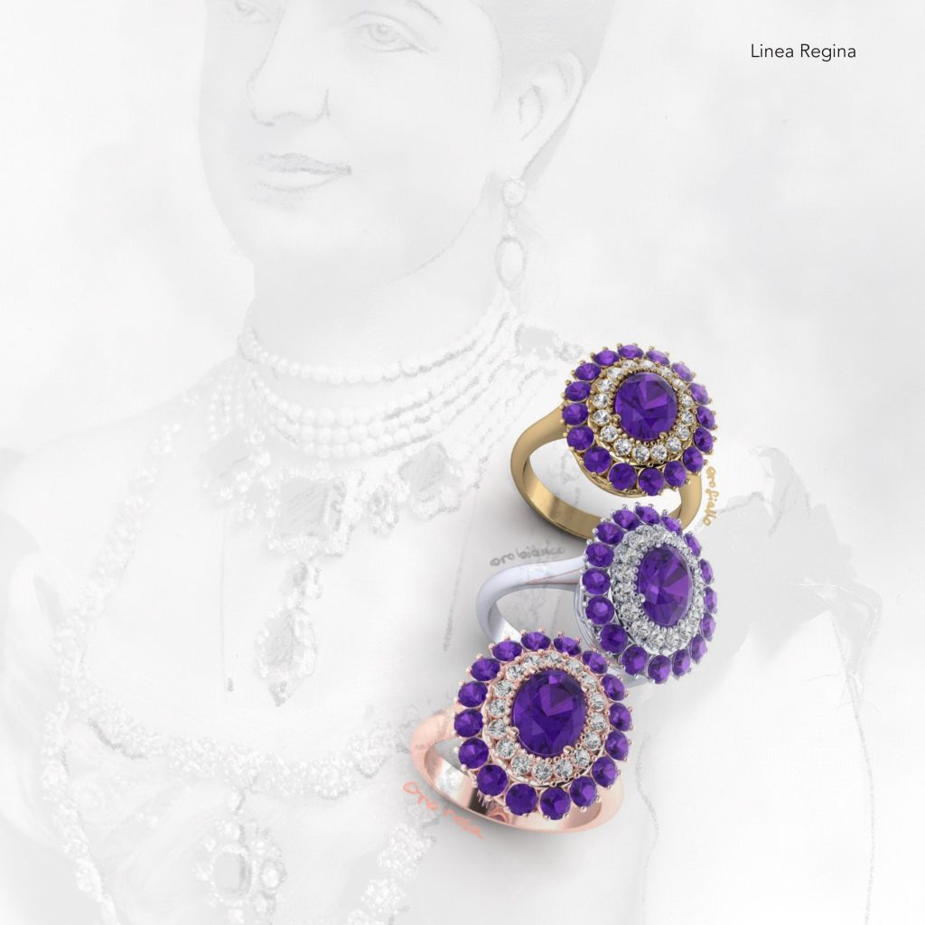 La linea di gioielli Regina Margherita, rappresenta un tributo alla prima regina d'Italia, Margherita di Savoia, icona dell'eleganza e femminilità italiana. Una donna che è stata capace di influenzare fortemente i gusti del tempo attraverso il suo stile impeccabile e grande personalità.