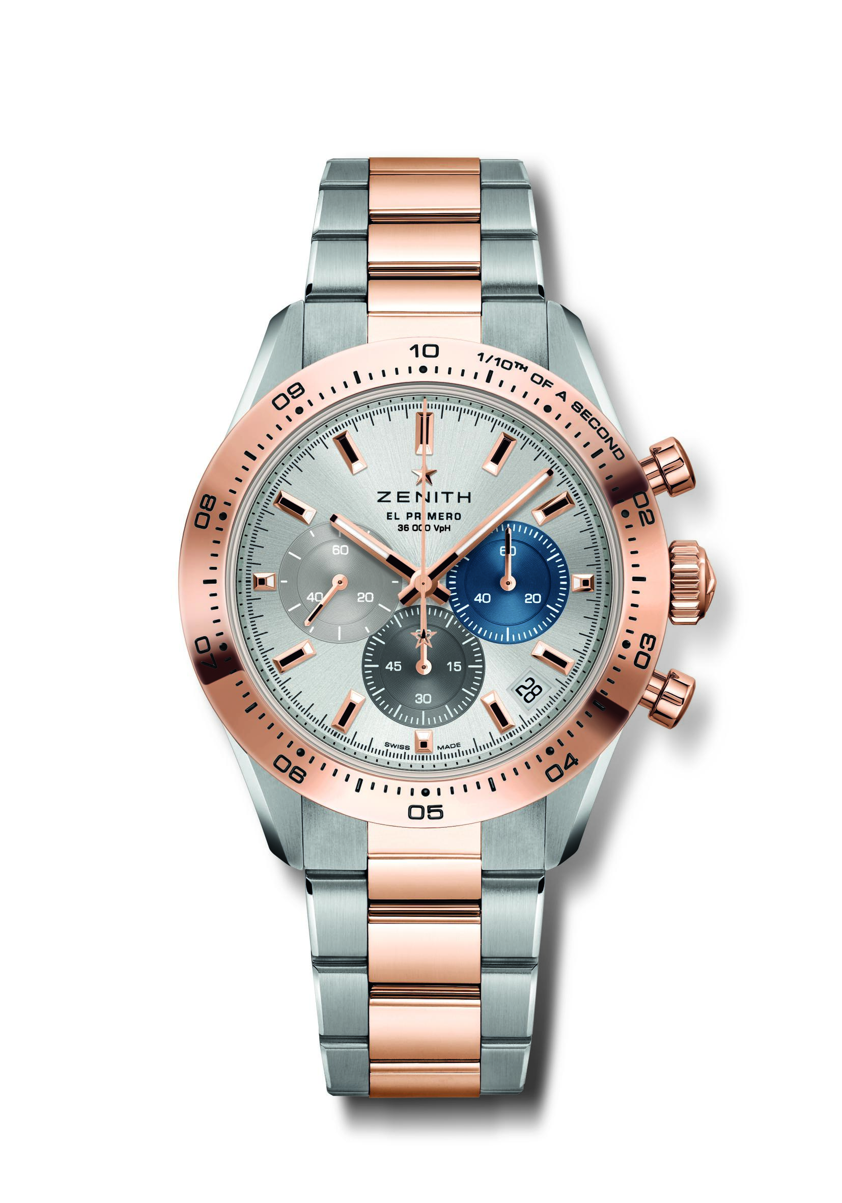 Il CHRONOMASTER Sport in acciaio e oro rosa con moderna cassa da 41 mm combina elementi dei cronografi passati ZENITH come il quadrante argento tricolore, i pulsanti a pompa e il bracciale in oro. Animato dal movimento cronografico automatico El Primero 3600 con precisione al 1/10 di secondo.