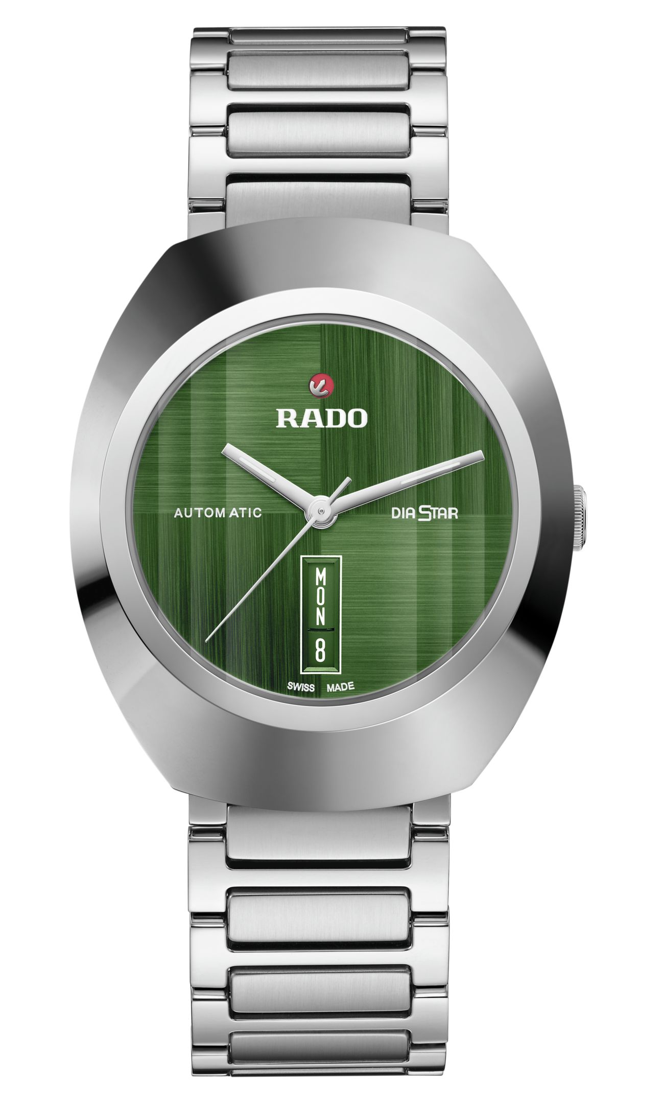 L’esclusivo DiaStar Original dispone di un diametro di 38 mm ed è impermeabile fino a 100 m. Caratterizzato da una cover in Ceramos™ super brillante con angoli e dettagli lucidi incastonata su una cassa monocromatica in acciaio, questo orologio vanta un cristallo zaffiro sfaccettato a linee parallele. Tra le caratteristiche figurano il quadrante verde spazzolato con lancette a bastone color rodio con Super-LumiNova® bianca e un datario con giorno della settimana nello stesso colore del quadrante. All’interno, il movimento automatico Rado R764 con spirale antimagnetica Nivachron™ vanta una riserva di carica di 80 ore. Il bracciale è in acciaio lucido e satinato.