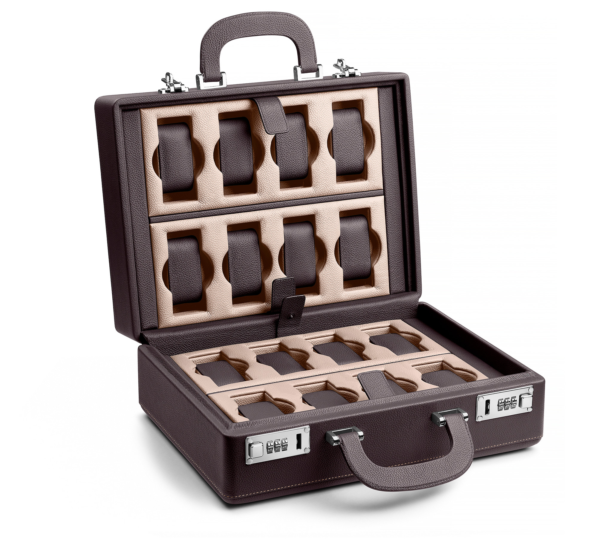 Valigetta con maniglie e chiusura a combinzione per 16 orologi di grandi dimensioni (diametro cassa, corona inclusa, 56 mm) con cinturino rigido o in pelle. Rivestita interamente in pelle di vitello sia all’esterno che all’interno. Chiusure color argento.