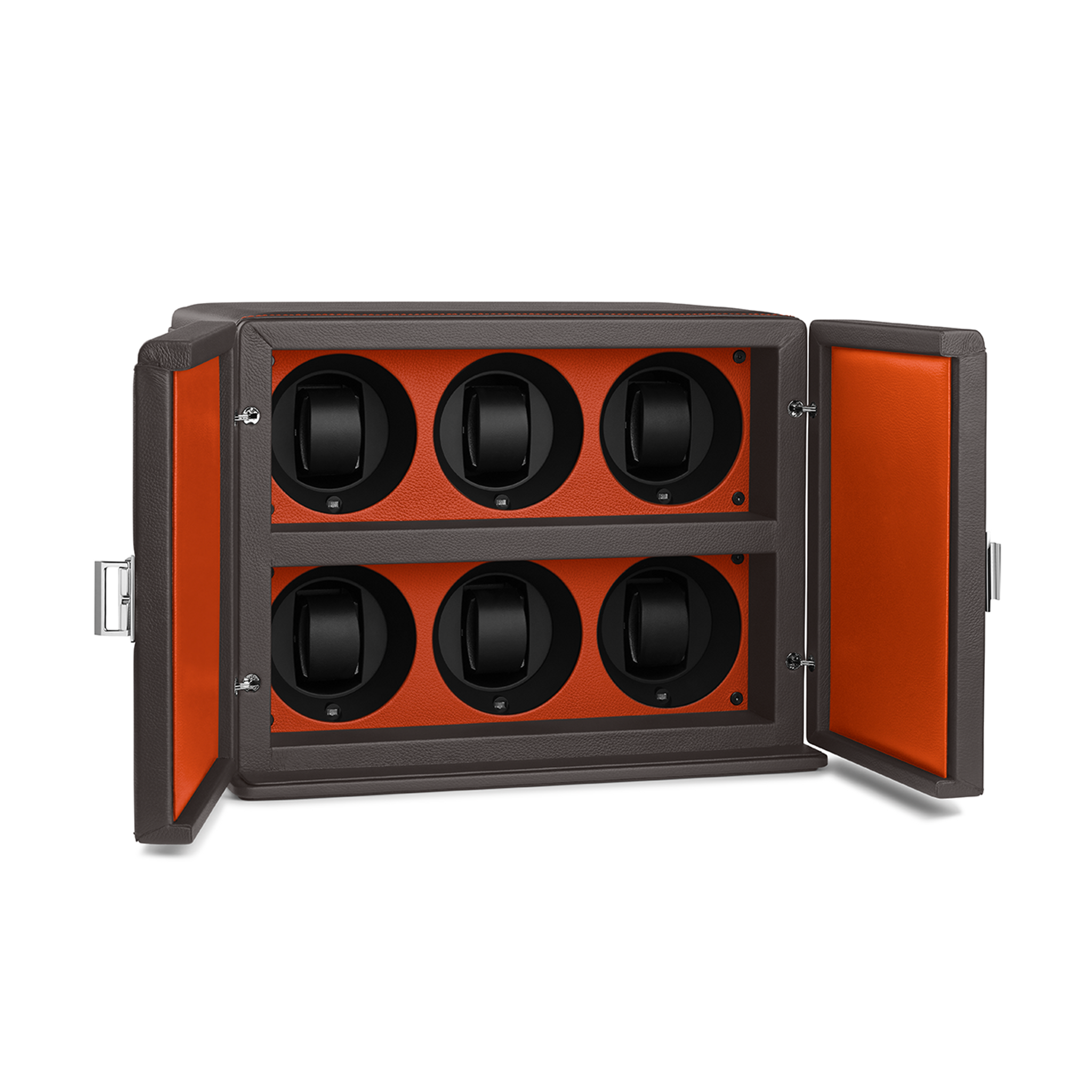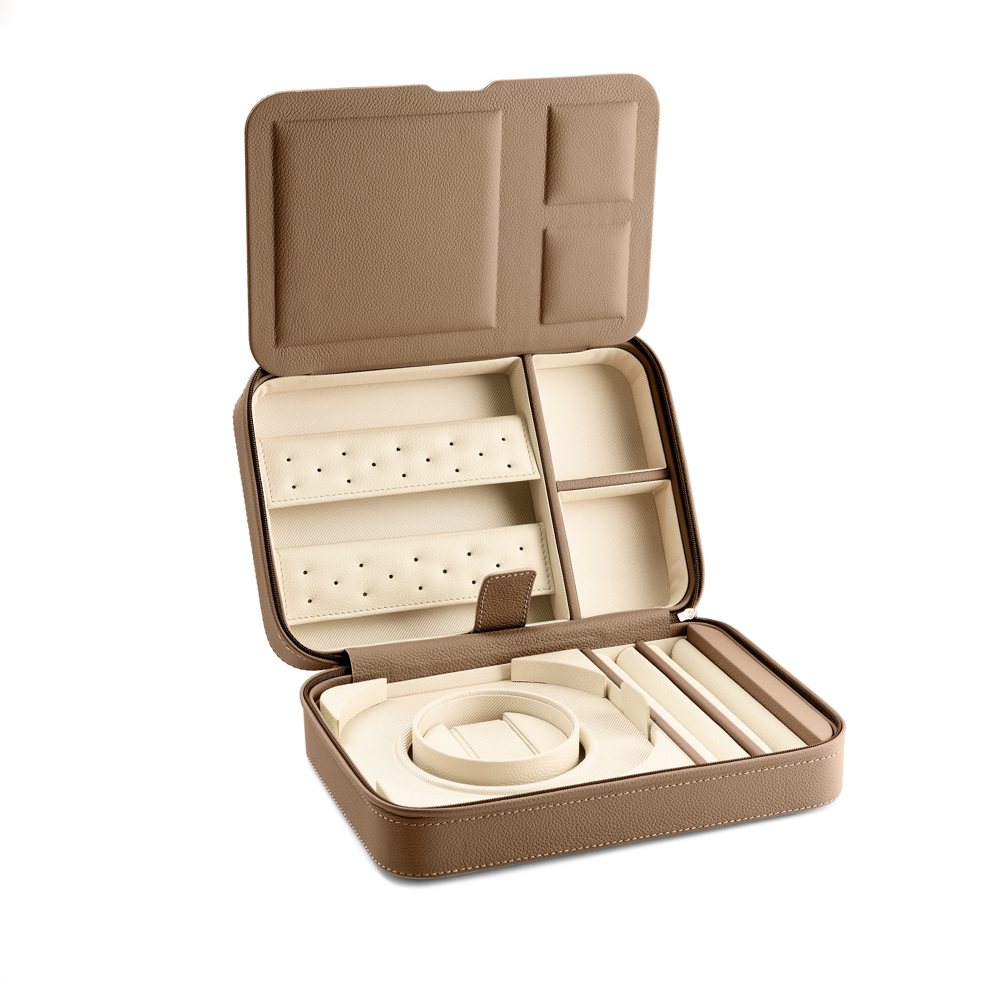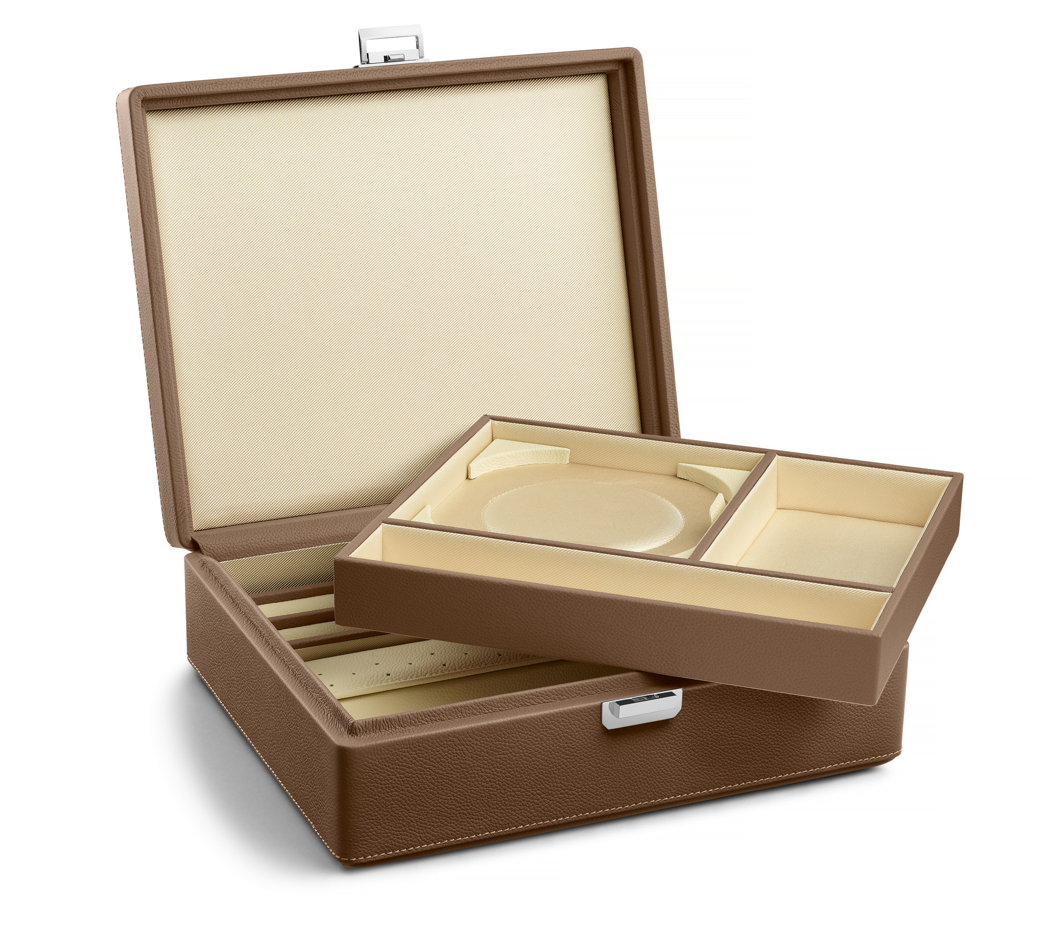 Valigetta con maniglie e chiusura a combinzione per 32 orologi di grandi dimensioni (diametro cassa, corona inclusa, 56 mm) con cinturino rigido o in pelle. Rivestita interamente in pelle di vitello sia all’esterno che all’interno. Chiusure color argento.
