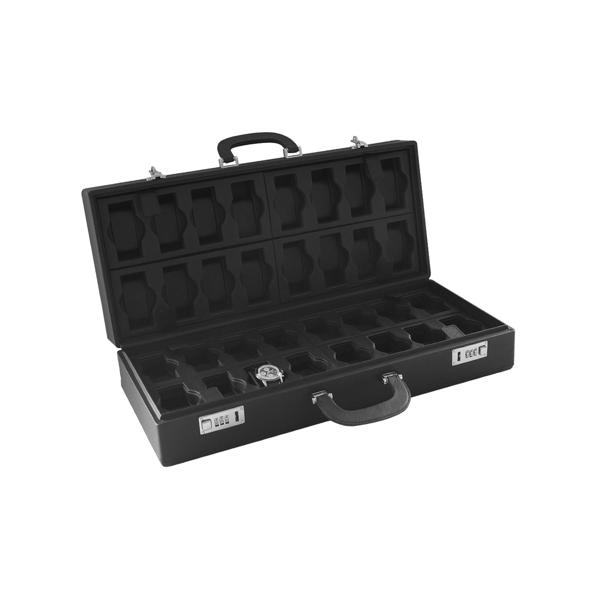 Valigetta con maniglie e chiusura a combinzione per 32 orologi di grandi dimensioni (diametro cassa, corona inclusa, 56 mm) con cinturino rigido o in pelle.