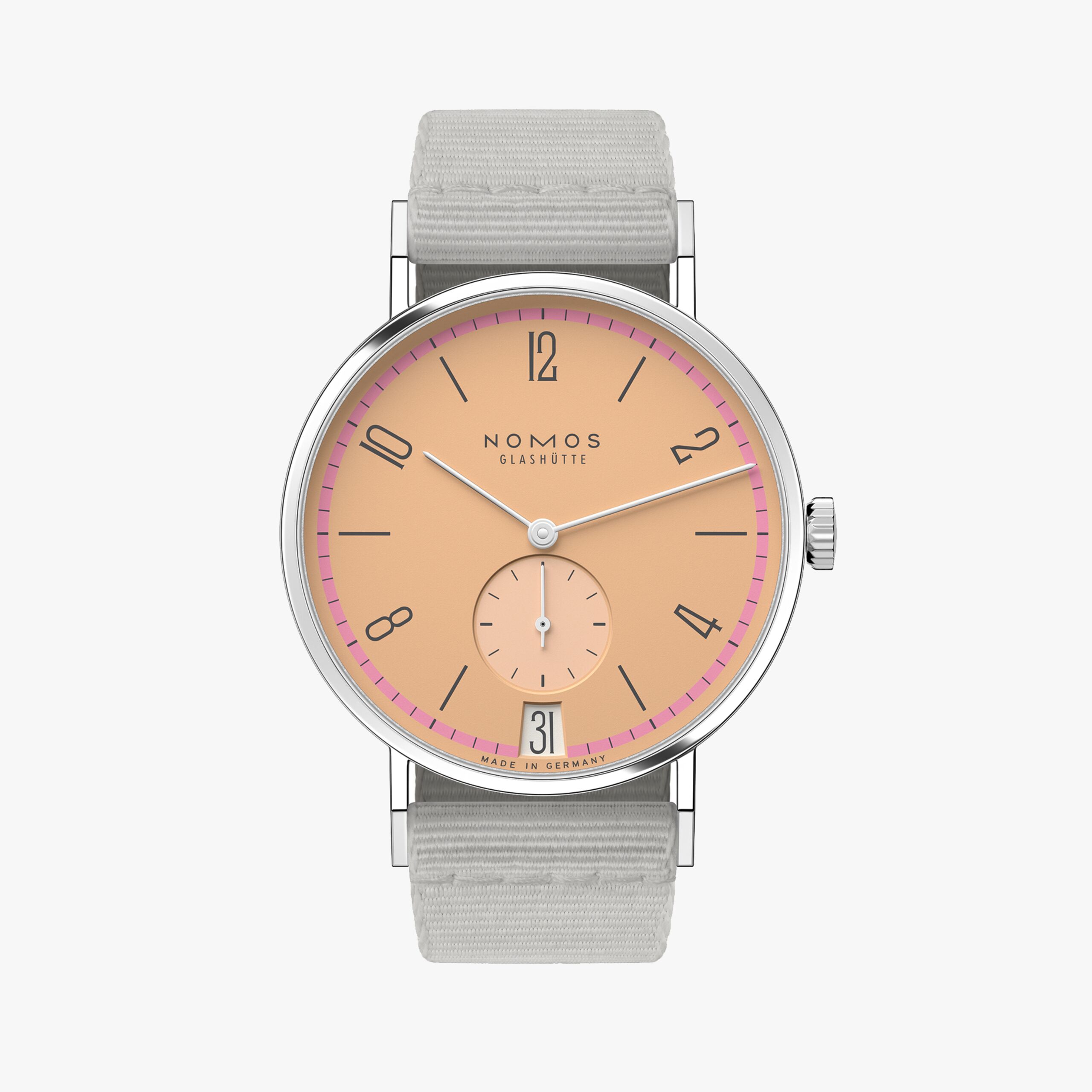 Il modello iconico NOMOS a colori. Pieno di energia e di complessità. Per questa edizione speciale di Tangente 38 datario a carica manuale, numerosi elementi del quadrante sono stati abbinati individualmente al carattere dell'orologio. 31 modelli speciali per ogni giorno del mese, 31 personalità differenti, con ogni versione limitata a 175 esemplari. Tangente datario Pastell ricorda la cipria, le rose essiccate e il filo utilizzato negli atelier di alta moda. Un orologio delicato che si accompagna particolarmente bene a vestiti vintage o a stili giapponesi.