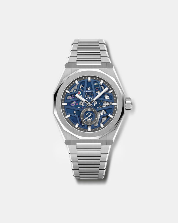 L’orologio DEFY Skyline Skeleton con cassa ottagonale in acciaio da 41 mm e lunetta sfaccettata, si distingue per il quadrante aperto blu, ispirato all’emblematica stella a quattro punte di ZENITH. Animato dal movimento di manifattura automatico scheletrato ad alta frequenza El Primero 3620 SK, dotato del primissimo indicatore con precisione al 1/10 di secondo. Bracciale in acciaio intercambiabile e cinturino in caucciù blu con motivo ispirato all’iconica stella ZENITH.