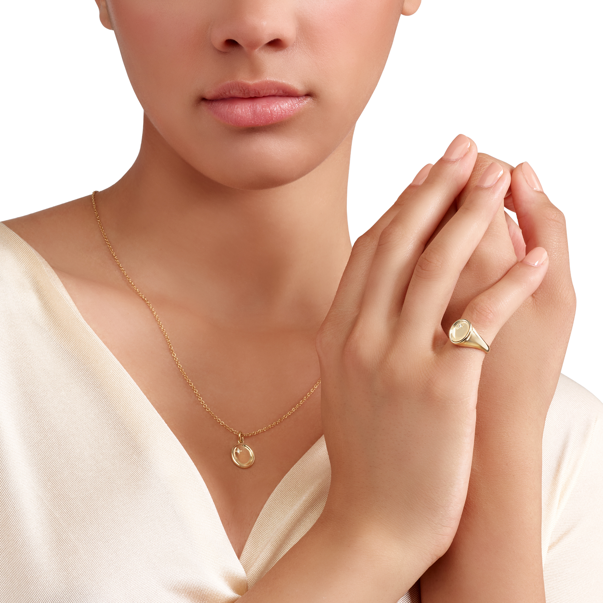 Il ciondolo Sigillo si distingue per le sue due forme archetipiche e cariche di significato: il quadrato e l’ovale. Nella versione ovale, realizzata in oro giallo 9K, la superficie satinata accoglie un diamante bianco che ne esalta la luminosità e l’eleganza. Pensato per essere indossato da solo o combinato in modi inediti e personali, Sigillo diventa un racconto in movimento - un gioiello che si adatta, si trasforma e riflette l’identità di chi lo porta. Ciondolo sigillo in oro giallo 9K con 1 diamante bianco (ct 0,02).