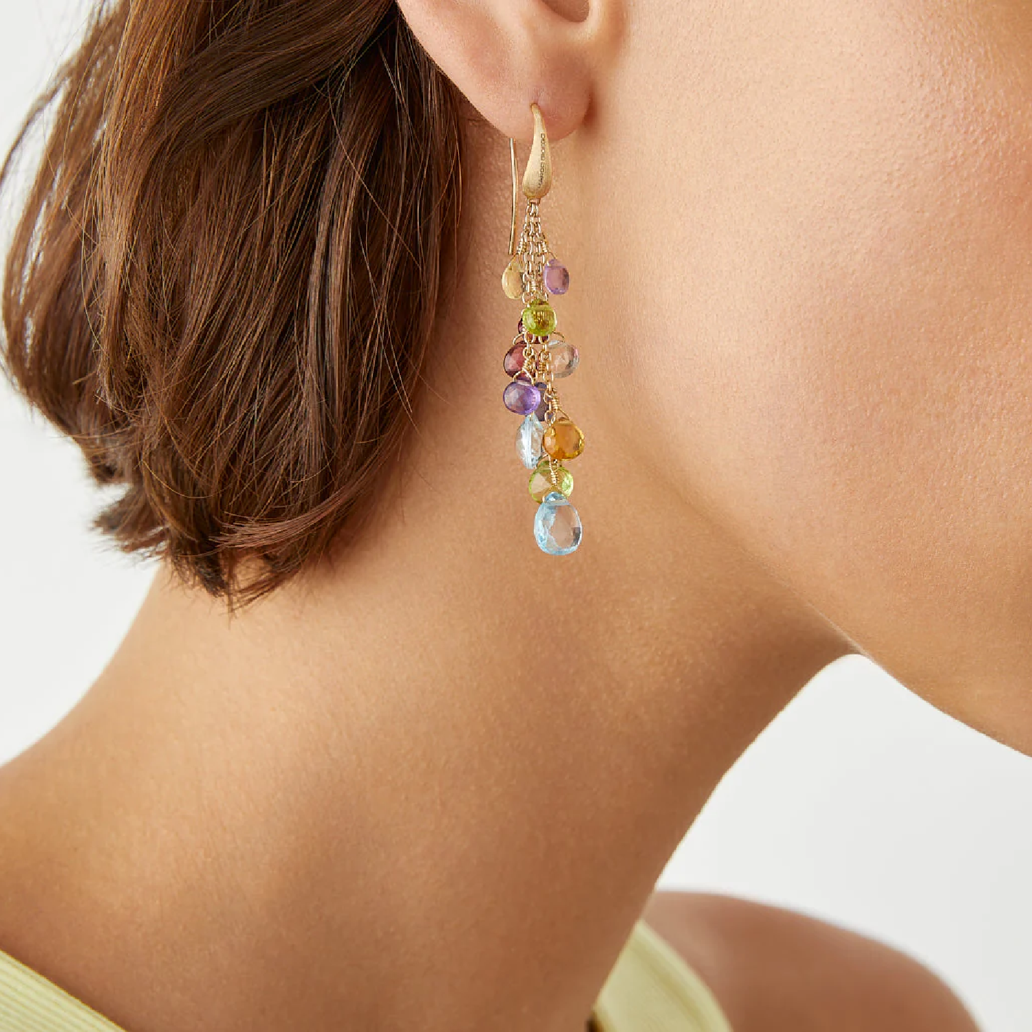 Una cascata di gemme multicolore dal caratteristico taglio a cuore e dalle tonalità vivaci contraddistingue questo bellissimo orecchino pendente. L'amo in oro giallo 18kt è inciso a mano con l'antica tecnica del bulino millerighe.