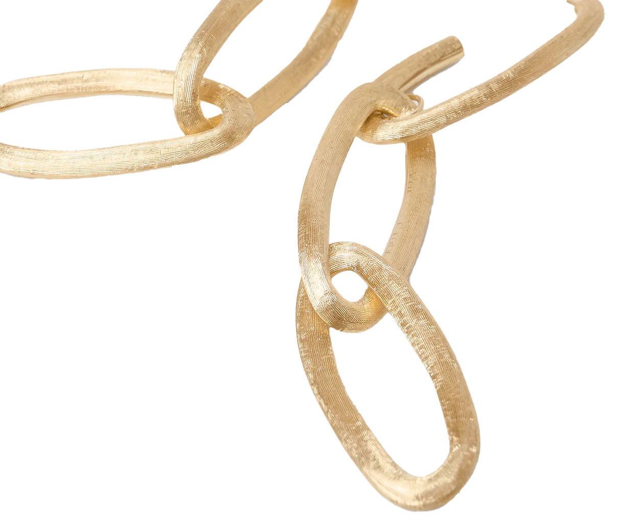 Una serie di tre ovali irregolari concatenati tra loro compone questo orecchino chandelier, in oro giallo 18kt, finemente inciso a mano con l'antica tecnica del bulino millerighe. Il perfetto equilibrio tra un gioiello statement e il design essenziale e distintivo delle nostre collezioni.