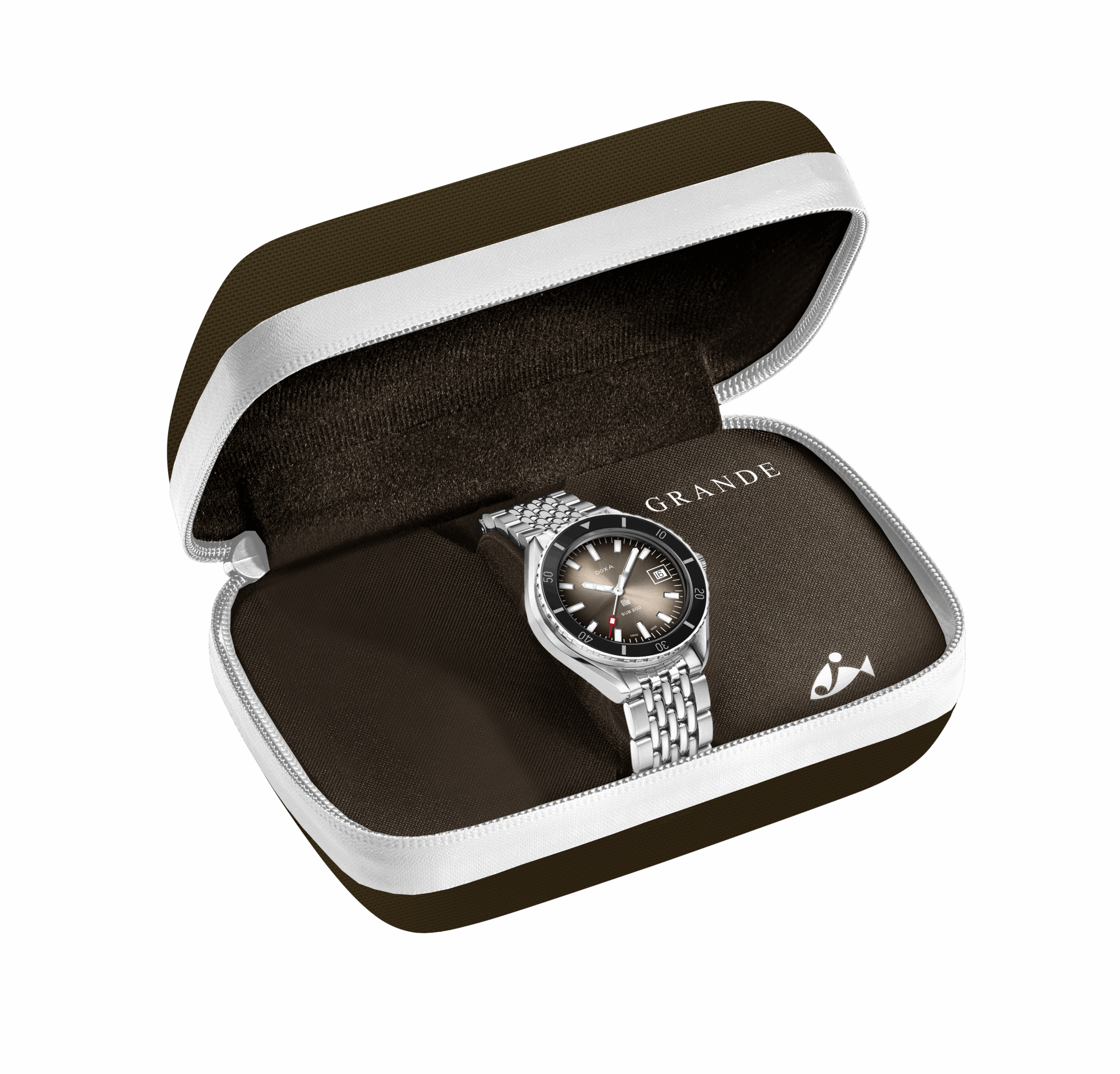 Con un diametro di 42 mm, ricavato da un unico blocco di acciaio inossidabile 316L della massima qualità e impermeabile fino a 200 metri, la cassa è protetta da un vetro zaffiro bombato antigraffio e antiriflesso tipo glass box. La lunetta unidirezionale nera e gli indici generosamente luminescenti garantiscono una lettura ottimale in ogni condizione. Dotato di tre lancette e di una finestrella della data posizionata a ore 3, il subacqueo è animato da un affidabile movimento automatico svizzero con una riserva di carica di circa 38 ore. Viene presentato con il bracciale iconico in acciaio a maglie “grani di riso” con chiusura déployante, e con un cinturino tessile marrone più leggero, tipo NATO, anch’esso con fibbia in acciaio inossidabile, incluso nella confezione.