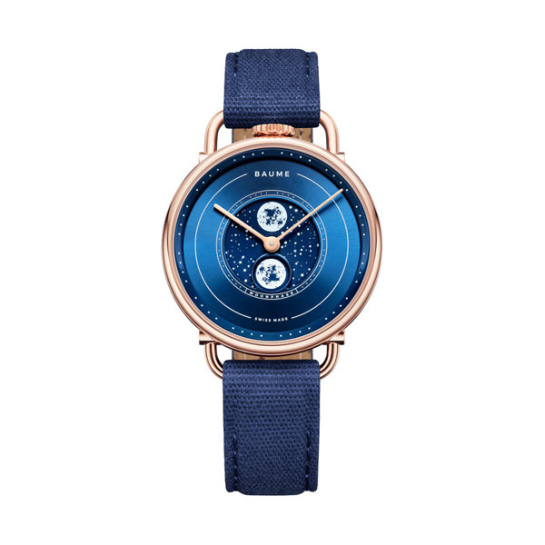 Segnatempo Baume con cassa rotonda in acciaio PVD 5N lucido e corona a ore 12, anse articolate e sistema di cinturini intercambiabili a bottoni. Presenta un quadrante laccato blu ornato da un esclusivo disco delle fasi di luna. È accompagnato da un cinturino in cotone blu.