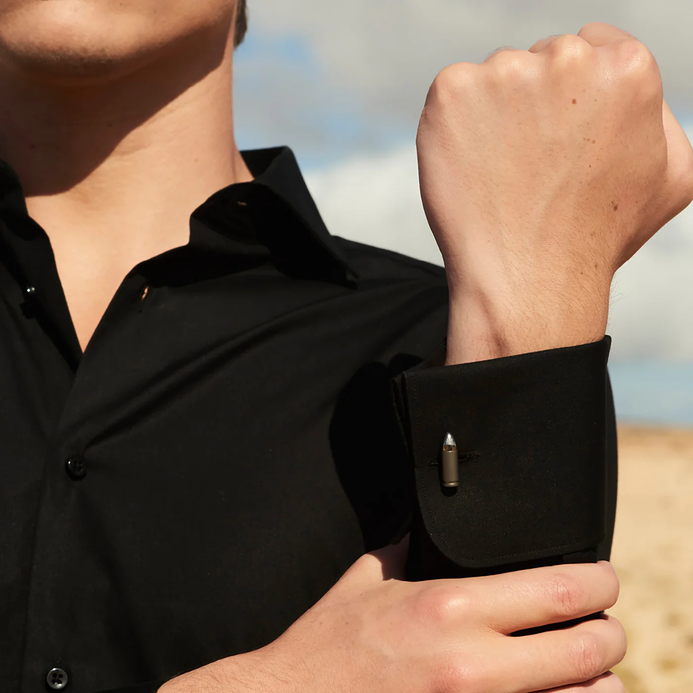 Gemelli da uomo della collezione Bang Bang in titanio DLC nero. Bang Bang modernizza con audacia il gioiello più tradizionale del guardaroba maschile. Attraverso le creazioni Bang Bang, Akillis sfida con ironia le convenzioni della gioielleria. Fin dalle sue prime creazioni, Caroline Gaspard ha dato vita a una collezione totemica, simbolo di determinazione incrollabile. Questi gioielli rappresentano il raggiungimento di un obiettivo di vita con convinzione incrollabile, rimanendo fedeli al proprio percorso.