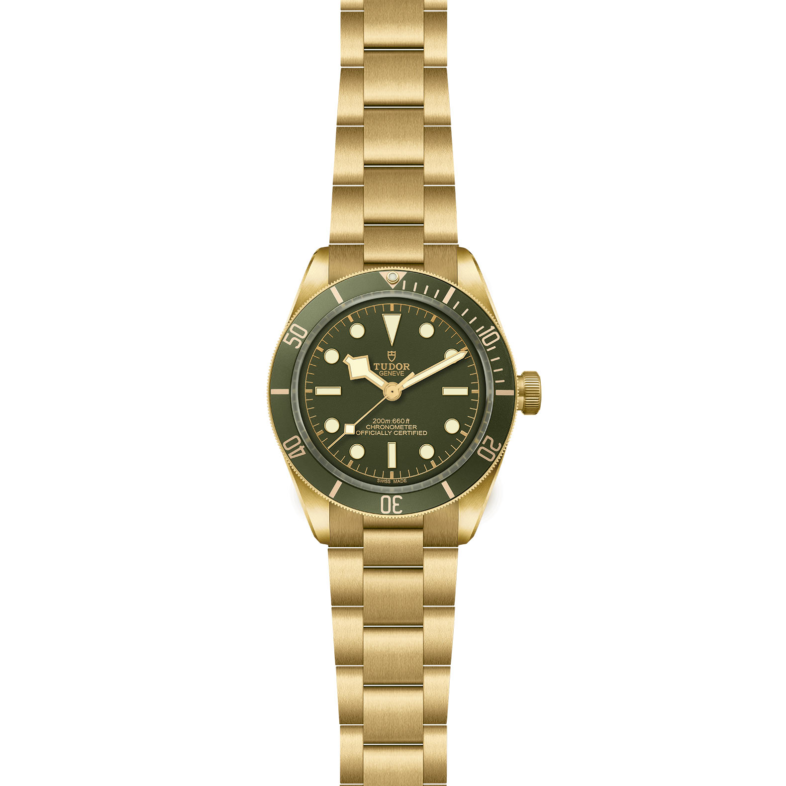 Bracciale a tre maglie in oro giallo 18 ct., finitura interamente satinata, con chiusura “T‑fit” in oro giallo 18 ct., Cassa in oro giallo 18 ct., 39 mm, finitura satinata Fondello trasparente con vetro zaffiro, Verde, bombato, Corona di carica a vite in oro giallo 18 ct., con la rosa TUDOR in rilievo e con tubo della corona in oro giallo 18 ct. satinato con lavorazione circolare, Impermeabile fino a 200 metri, Lunetta girevole unidirezionale in oro giallo 18 ct. con disco graduato 60 minuti in alluminio anodizzato verde opaco e indici e numeri in oro, Oro, Calibro di Manifattura MT5400 (COSC) Movimento meccanico a carica automatica con rotore bidirezionale, Quadrante colorato, Medio, Vetro zaffiro bombato