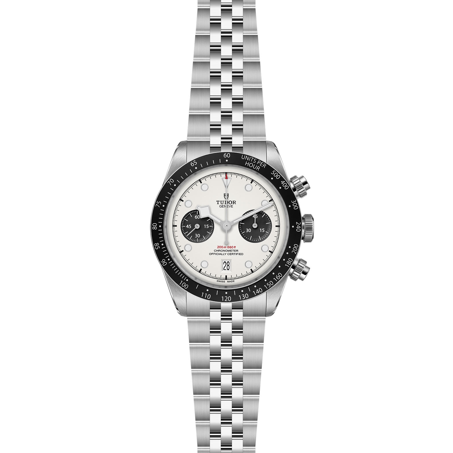 Bracciale a cinque maglie in acciaio, finitura lucida e satinata, chiusura TUDOR “T‑fit” con sistema di regolazione rapida, Cassa in acciaio, 41 mm, finitura lucida e satinata, Opalino con contatori neri, bombato, Corona di carica a vite in acciaio con la rosa TUDOR in rilievo Pulsanti a vite in acciaio a ore 2 e 4, Impermeabile fino a 200 metri, Lunetta fissa in acciaio con disco in alluminio anodizzato nero opaco, scala tachimetrica e graduazioni argentate, acciaio, Calibro di Manifattura MT5813 con funzione cronografo Movimento cronografo meccanico a carica automatica con rotore bidirezionale, Quadrante chiaro, grande, Vetro zaffiro bombato