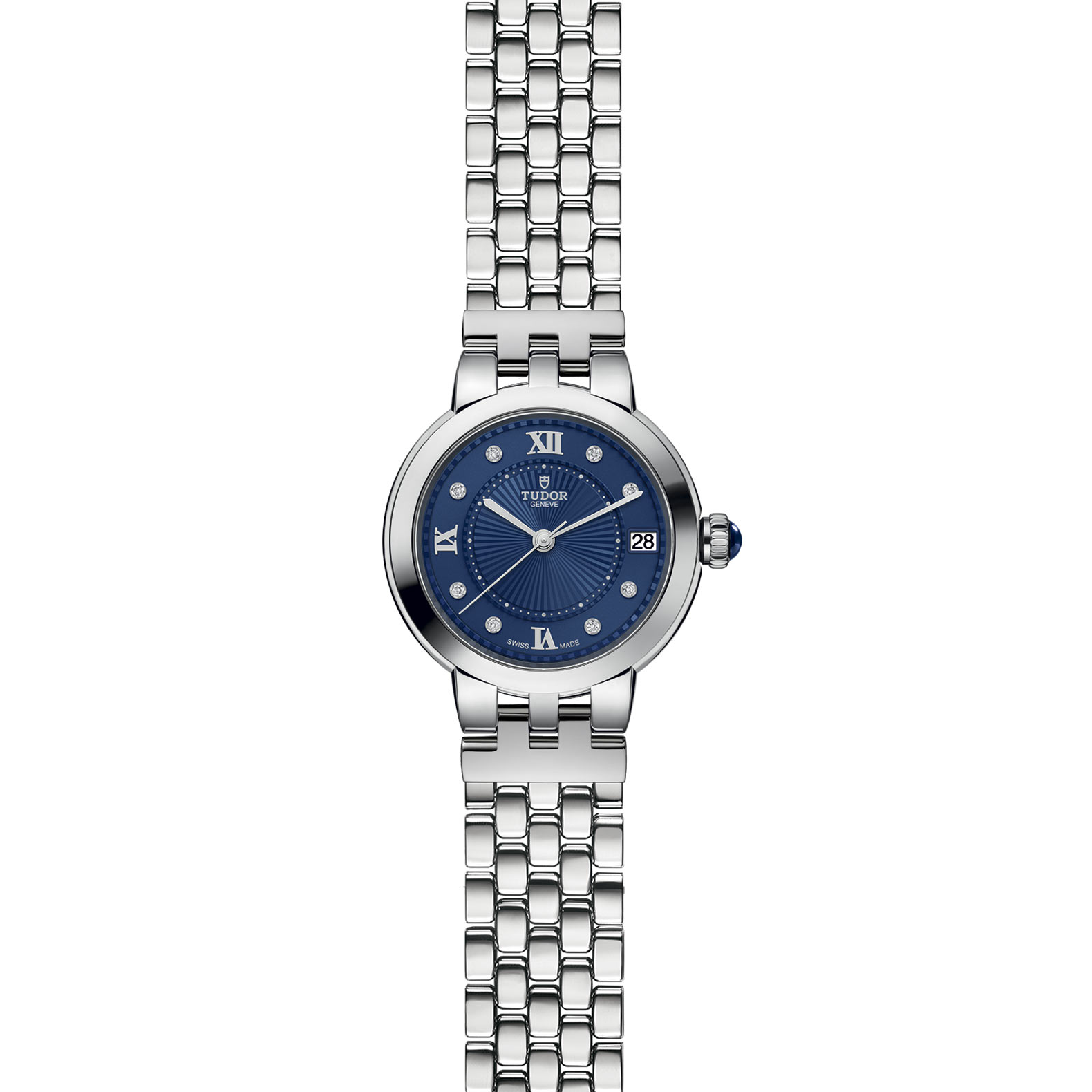 Bracciale in acciaio con chiusura pieghevole e fermaglio di sicurezza Elementi di giunzione in acciaio, Cassa in acciaio, 34 mm, finitura lucida, Blu con diamanti, Corona di carica a vite in acciaio con cabochon blu trasparente, Impermeabile fino a 100 m, Lunetta liscia in acciaio, finitura lucida, acciaio, Movimento meccanico a carica automatica, Calibro T601, Quadrante colorato, Piccolo, Vetro zaffiro bombato