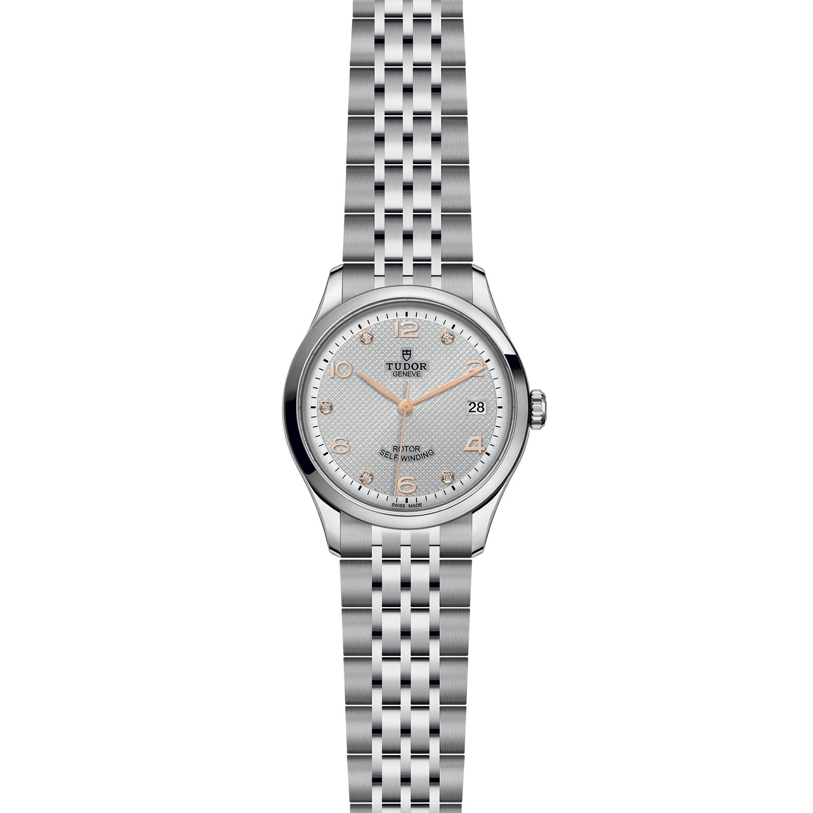 Bracciale in acciaio, 7 file, maglie esterne satinate, maglie centrali lucide, con chiusura pieghevole e fermaglio di sicurezza, Cassa in acciaio, 36 mm, finitura lucida, Argentato, bombato, con decorazione in rilievo e 5 diamanti, Corona di carica a vite in acciaio con il logo TUDOR in rilievo, Impermeabile fino a 100 m, Lunetta liscia in acciaio, finitura lucida, acciaio, Movimento meccanico a carica automatica, Calibro T601, Quadrante chiaro, Medio, Vetro zaffiro