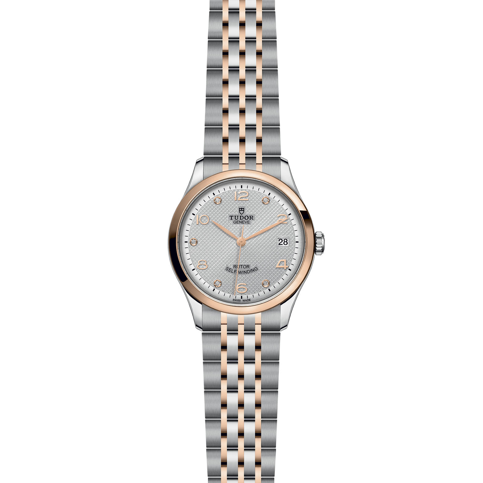 Prime maglie centrali in acciaio o in oro rosa massiccio. Maglie centrali restanti in acciaio o acciaio rivestito da uno strato di oro rosa di 0,2 mm, Cassa in acciaio, 36 mm, finitura lucida, Argentato, bombato, con decorazione in rilievo e 5 diamanti, Corona di carica a vite in acciaio con il logo TUDOR in rilievo, Impermeabile fino a 100 m, Lunetta liscia in acciaio rivestito da uno strato di oro rosa di 0,3 mm, finitura lucida, acciaio e oro, Movimento meccanico a carica automatica, Calibro T601, Quadrante chiaro, Medio, Vetro zaffiro