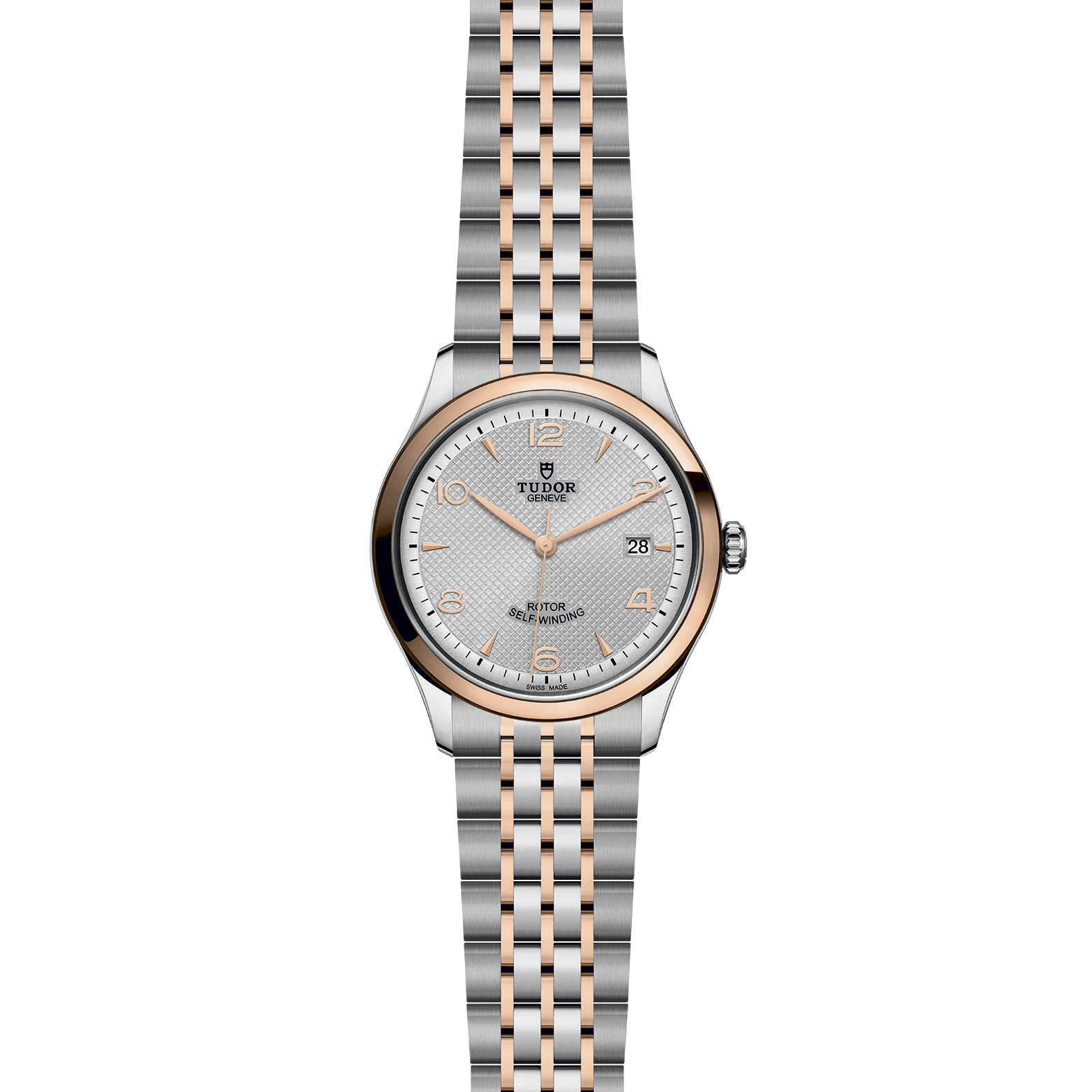 Prime maglie centrali in acciaio o in oro rosa massiccio. Maglie centrali restanti in acciaio o acciaio rivestito da uno strato di oro rosa di 0,2 mm, Cassa in acciaio, 39 mm, finitura lucida, Argentato, bombato, con decorazione in rilievo, Corona di carica a vite in acciaio con il logo TUDOR in rilievo, Impermeabile fino a 100 m, Lunetta liscia in acciaio rivestito da uno strato di oro rosa di 0,3 mm, finitura lucida, acciaio e oro, Movimento meccanico a carica automatica, Calibro T601, Quadrante chiaro, Medio, Vetro zaffiro