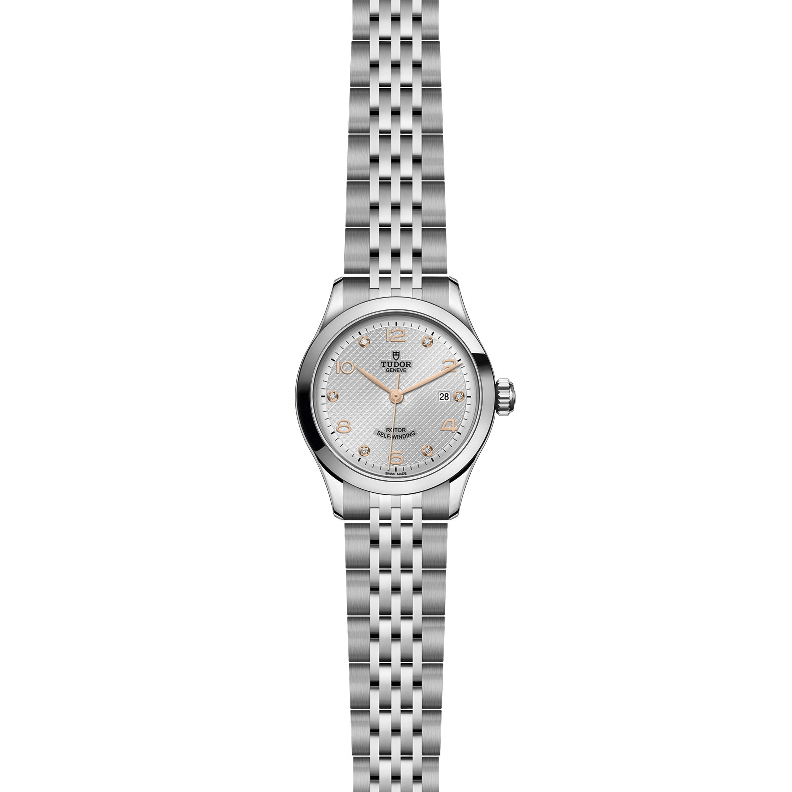 Bracciale in acciaio, 7 file, maglie esterne satinate, maglie centrali lucide, con chiusura pieghevole e fermaglio di sicurezza, Cassa in acciaio, 28 mm, finitura lucida, Argentato, bombato, con decorazione in rilievo e 6 diamanti, Corona di carica a vite in acciaio con il logo TUDOR in rilievo, Impermeabile fino a 100 m, Lunetta liscia in acciaio, finitura lucida, acciaio, Movimento meccanico a carica automatica, Calibro T201, Quadrante chiaro, Piccolo, Vetro zaffiro