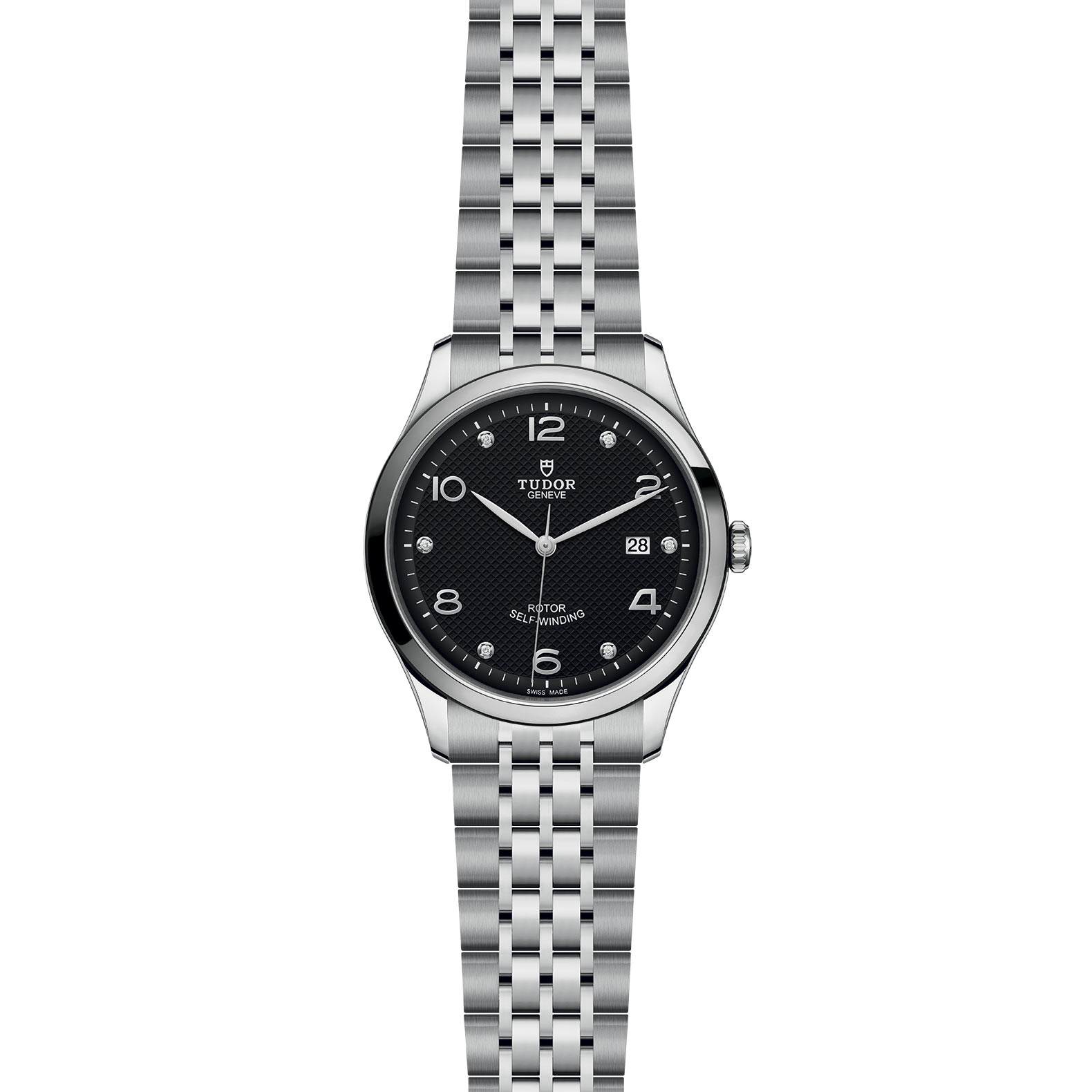 Bracciale in acciaio, 7 file, maglie esterne satinate, maglie centrali lucide, con chiusura pieghevole e fermaglio di sicurezza, Cassa in acciaio, 41 mm, finitura lucida, Nero, bombato, con decorazione in rilievo e 6 diamanti, Corona di carica a vite in acciaio con il logo TUDOR in rilievo, Impermeabile fino a 100 m, Lunetta liscia in acciaio, finitura lucida, acciaio, Movimento meccanico a carica automatica, Calibro T601, Quadrante scuro, grande, Vetro zaffiro