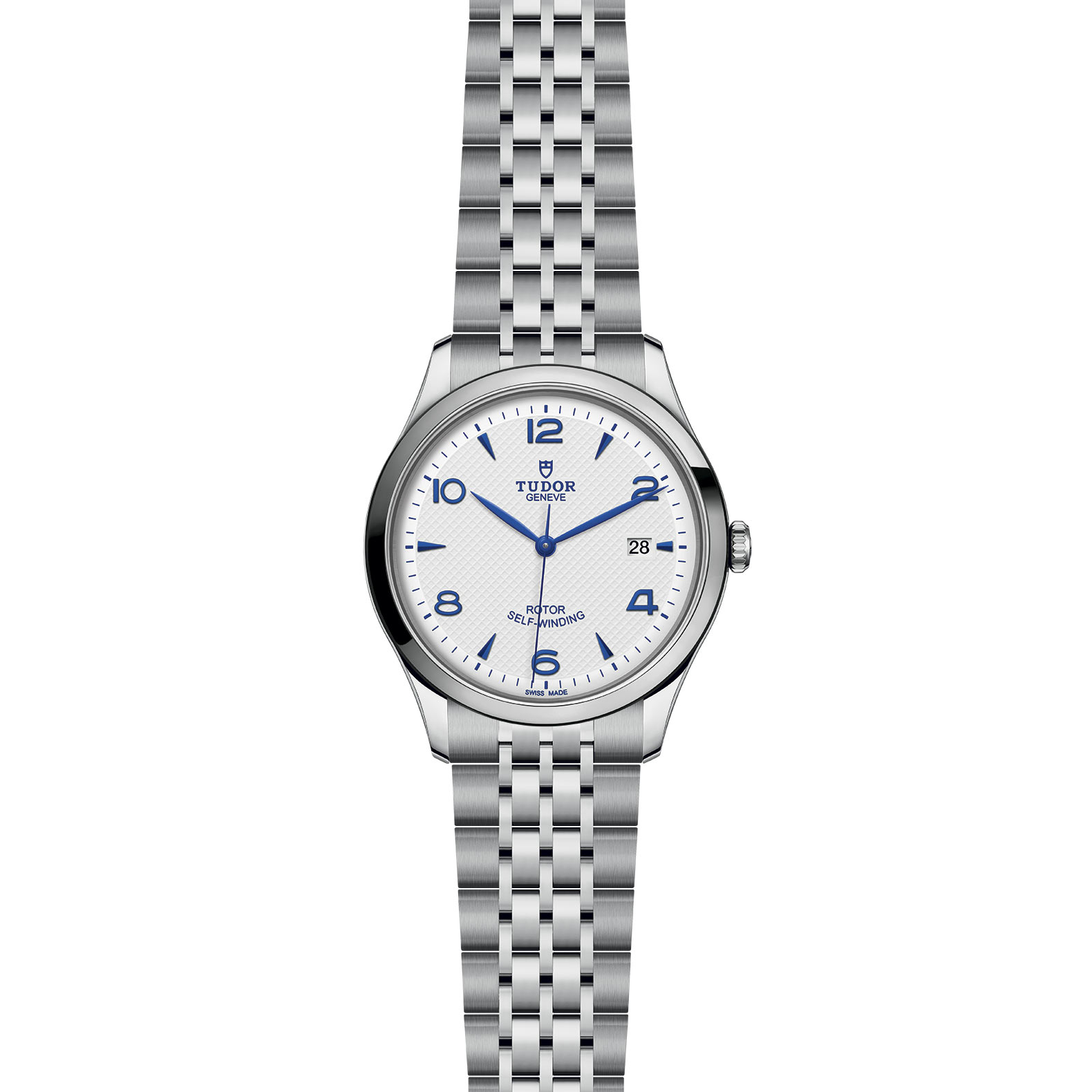 Bracciale in acciaio, 7 file, maglie esterne satinate, maglie centrali lucide, con chiusura pieghevole e fermaglio di sicurezza, Cassa in acciaio, 41 mm, finitura lucida, Opalino, bombato, con decorazione in rilievo, Corona di carica a vite in acciaio con il logo TUDOR in rilievo, Impermeabile fino a 100 m, Lunetta liscia in acciaio, finitura lucida, acciaio, Movimento meccanico a carica automatica, Calibro T601, Quadrante chiaro, grande, Vetro zaffiro