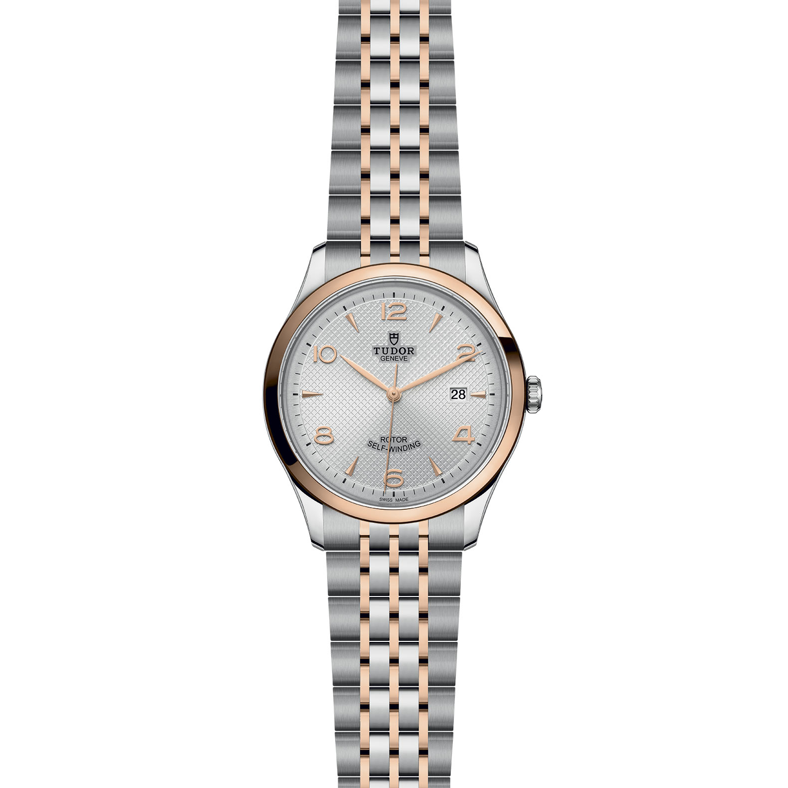 Prime maglie centrali in acciaio o in oro rosa massiccio. Maglie centrali restanti in acciaio o acciaio rivestito da uno strato di oro rosa di 0,2 mm, Cassa in acciaio, 41 mm, finitura lucida, Argentato, bombato, con decorazione in rilievo, Corona di carica a vite in acciaio con il logo TUDOR in rilievo, Impermeabile fino a 100 m, Lunetta liscia in acciaio rivestito da uno strato di oro rosa di 0,3 mm, finitura lucida, acciaio e oro, Movimento meccanico a carica automatica, Calibro T601, Quadrante chiaro, grande, Vetro zaffiro
