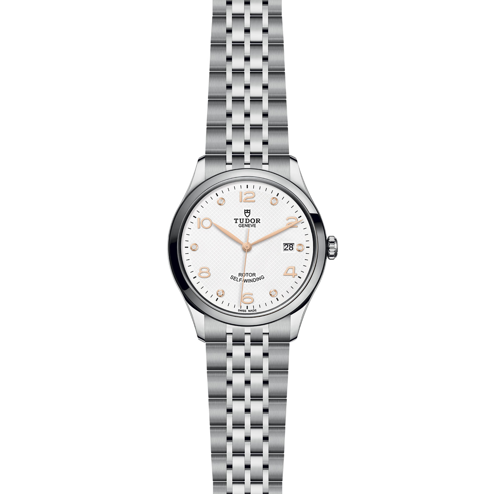 Bracciale in acciaio, 7 file, maglie esterne satinate, maglie centrali lucide, con chiusura pieghevole e fermaglio di sicurezza, Cassa in acciaio, 39 mm, finitura lucida, Bianco, bombato, con decorazione in rilievo e 6 diamanti, Corona di carica a vite in acciaio con il logo TUDOR in rilievo, Impermeabile fino a 100 m, Lunetta liscia in acciaio, finitura lucida, acciaio, Movimento meccanico a carica automatica, Calibro T601, Quadrante chiaro, Medio, Vetro zaffiro