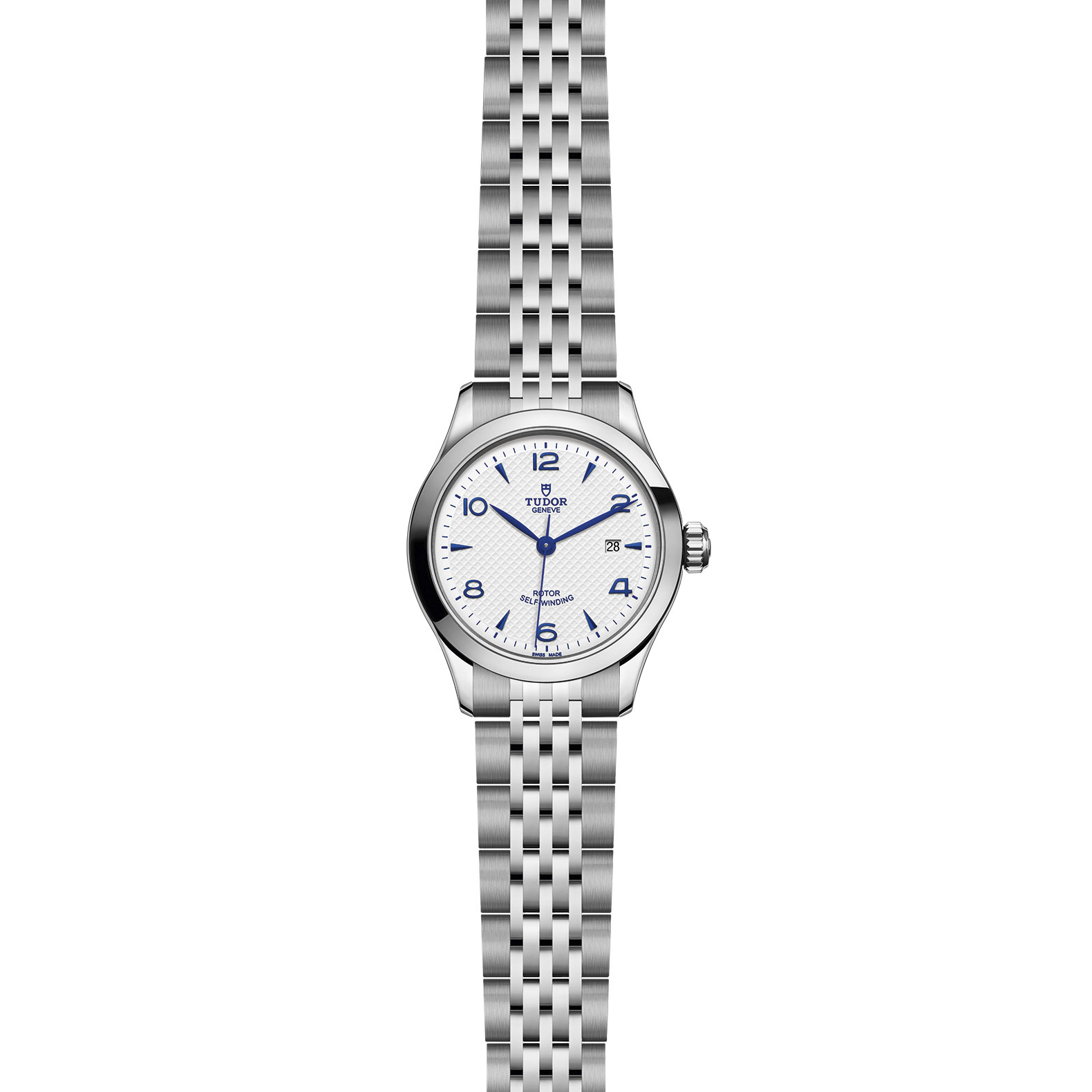 Bracciale in acciaio, 7 file, maglie esterne satinate, maglie centrali lucide, con chiusura pieghevole e fermaglio di sicurezza, Cassa in acciaio, 28 mm, finitura lucida, Opalino, bombato, con decorazione in rilievo, Corona di carica a vite in acciaio con il logo TUDOR in rilievo, Impermeabile fino a 100 m, Lunetta liscia in acciaio, finitura lucida, acciaio, Movimento meccanico a carica automatica, Calibro T201, Quadrante chiaro, Piccolo, Vetro zaffiro