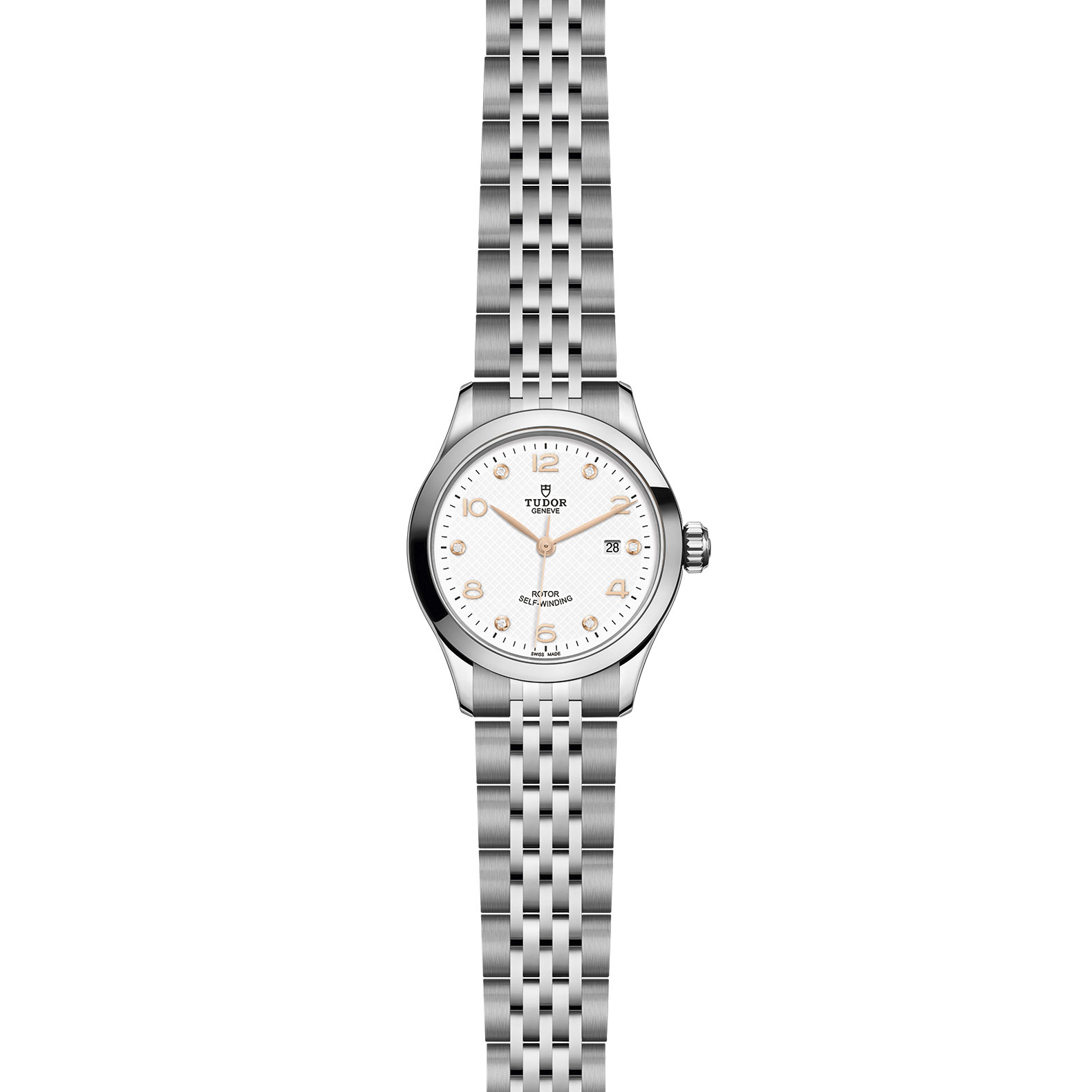 Bracciale in acciaio, 7 file, maglie esterne satinate, maglie centrali lucide, con chiusura pieghevole e fermaglio di sicurezza, Cassa in acciaio, 28 mm, finitura lucida, Bianco, bombato, con decorazione in rilievo e 6 diamanti, Corona di carica a vite in acciaio con il logo TUDOR in rilievo, Impermeabile fino a 100 m, Lunetta liscia in acciaio, finitura lucida, acciaio, Movimento meccanico a carica automatica, Calibro T201, Quadrante chiaro, Piccolo, Vetro zaffiro