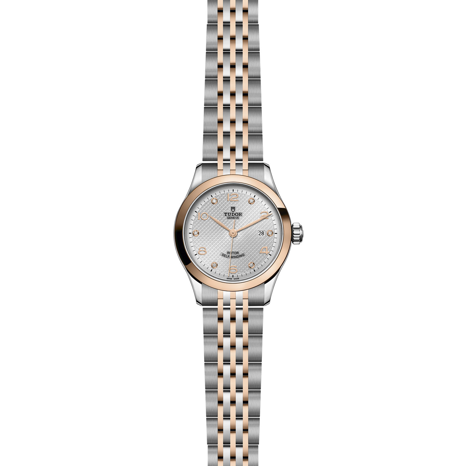 Prime maglie centrali in acciaio o in oro rosa massiccio. Maglie centrali restanti in acciaio o acciaio rivestito da uno strato di oro rosa di 0,2 mm, Cassa in acciaio, 28 mm, finitura lucida, Argentato, bombato, con decorazione in rilievo e 6 diamanti, Corona di carica a vite in acciaio con il logo TUDOR in rilievo, Impermeabile fino a 100 m, Lunetta liscia in oro rosa massiccio, finitura lucida, acciaio e oro, Movimento meccanico a carica automatica, Calibro T201, Quadrante chiaro, Piccolo, Vetro zaffiro