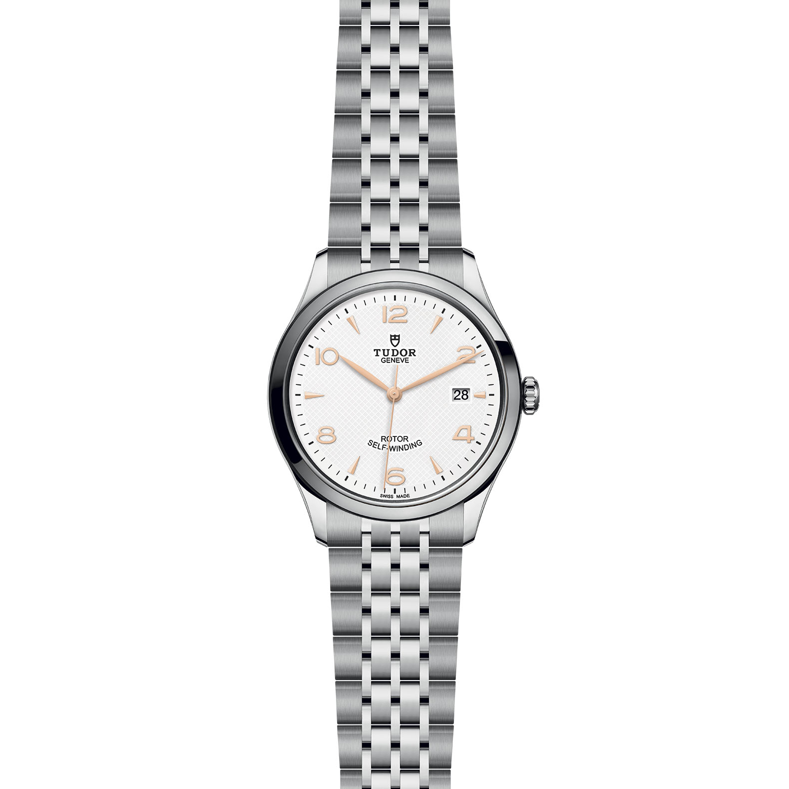 Bracciale in acciaio, 7 file, maglie esterne satinate, maglie centrali lucide, con chiusura pieghevole e fermaglio di sicurezza, Cassa in acciaio, 39 mm, finitura lucida, Bianco, bombato, con decorazione in rilievo, Corona di carica a vite in acciaio con il logo TUDOR in rilievo, Impermeabile fino a 100 m, Lunetta liscia in acciaio, finitura lucida, acciaio, Movimento meccanico a carica automatica, Calibro T601, Quadrante chiaro, Medio, Vetro zaffiro