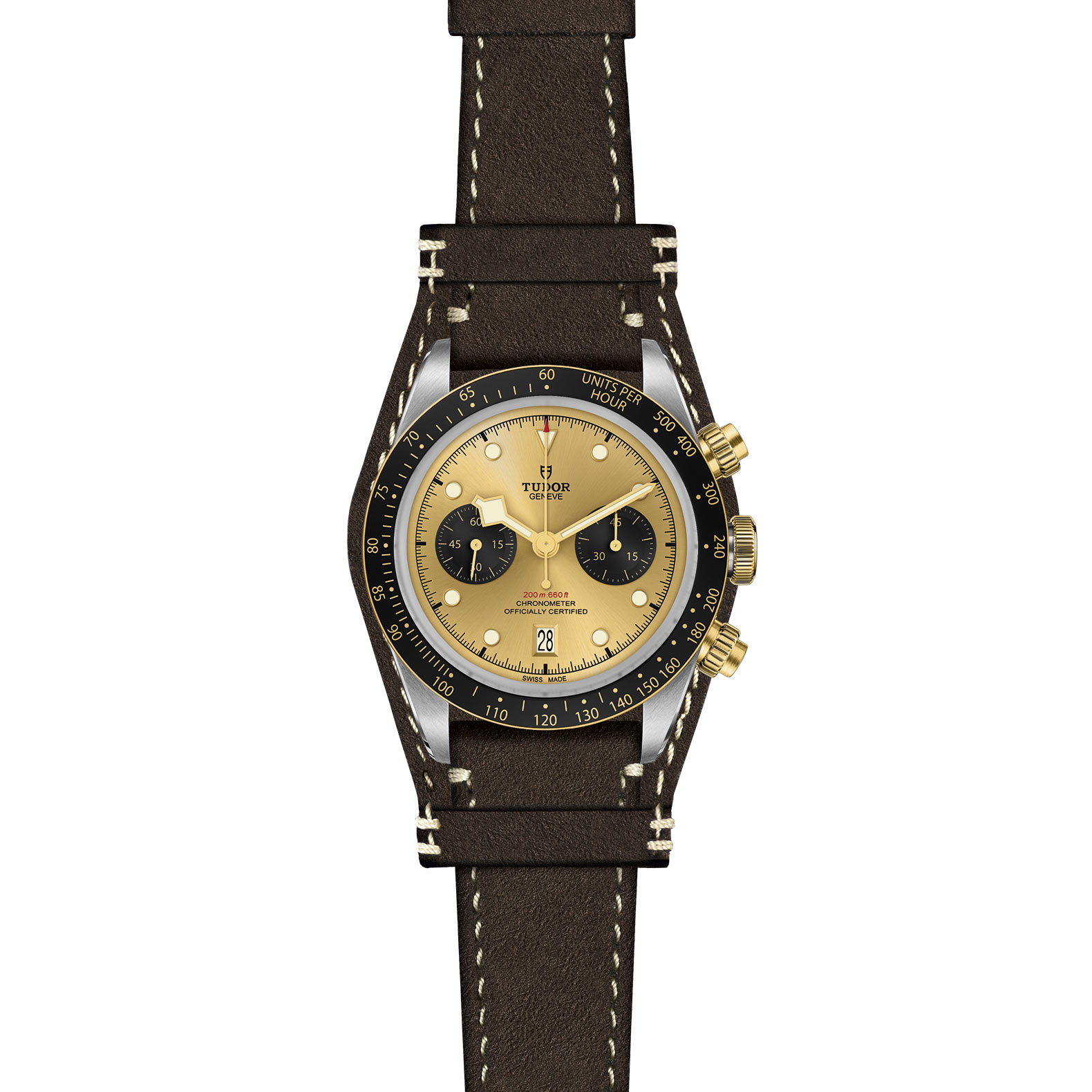 Cinturino in cuoio marrone con polsino rimovibile, con chiusura pieghevole e fermaglio di sicurezza, Cassa in acciaio, 41 mm, finitura lucida e satinata, Color champagne con contatori neri, bombato, Corona di carica a vite con la rosa TUDOR in rilievo. Pulsanti a vite in oro giallo massiccio a ore 2 e 4. Acciaio rivestito da uno strato di oro giallo di 0,3 mm, Impermeabile fino a 200 metri, Lunetta fissa in oro giallo massiccio con disco in alluminio anodizzato nero opaco, scala tachimetrica e indici in oro giallo, acciaio e oro, Calibro di Manifattura MT5813 con funzione cronografo Movimento cronografo meccanico a carica automatica con rotore bidirezionale, Quadrante colorato, grande, Vetro zaffiro bombato
