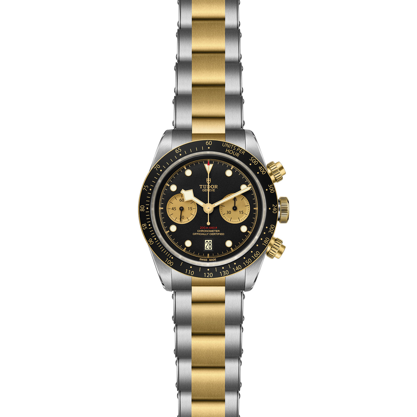 Prime maglie centrali a ore 6 e 12 in oro giallo massiccio. Maglie centrali restanti in acciaio o acciaio rivestito da uno strato di oro giallo di 0,2 mm. Chiusura pieghevole e fermaglio di sicurezza, Cassa in acciaio, 41 mm, finitura lucida e satinata, Nero, bombato, Corona di carica a vite con la rosa TUDOR in rilievo. Pulsanti a vite in oro giallo massiccio a ore 2 e 4. Acciaio rivestito da uno strato di oro giallo di 0,3 mm, Impermeabile fino a 200 metri, Lunetta fissa in oro giallo massiccio con disco in alluminio anodizzato nero opaco, scala tachimetrica e indici in oro giallo, acciaio e oro, Calibro di Manifattura MT5813 con funzione cronografo Movimento cronografo meccanico a carica automatica con rotore bidirezionale, Quadrante scuro, grande, Vetro zaffiro bombato