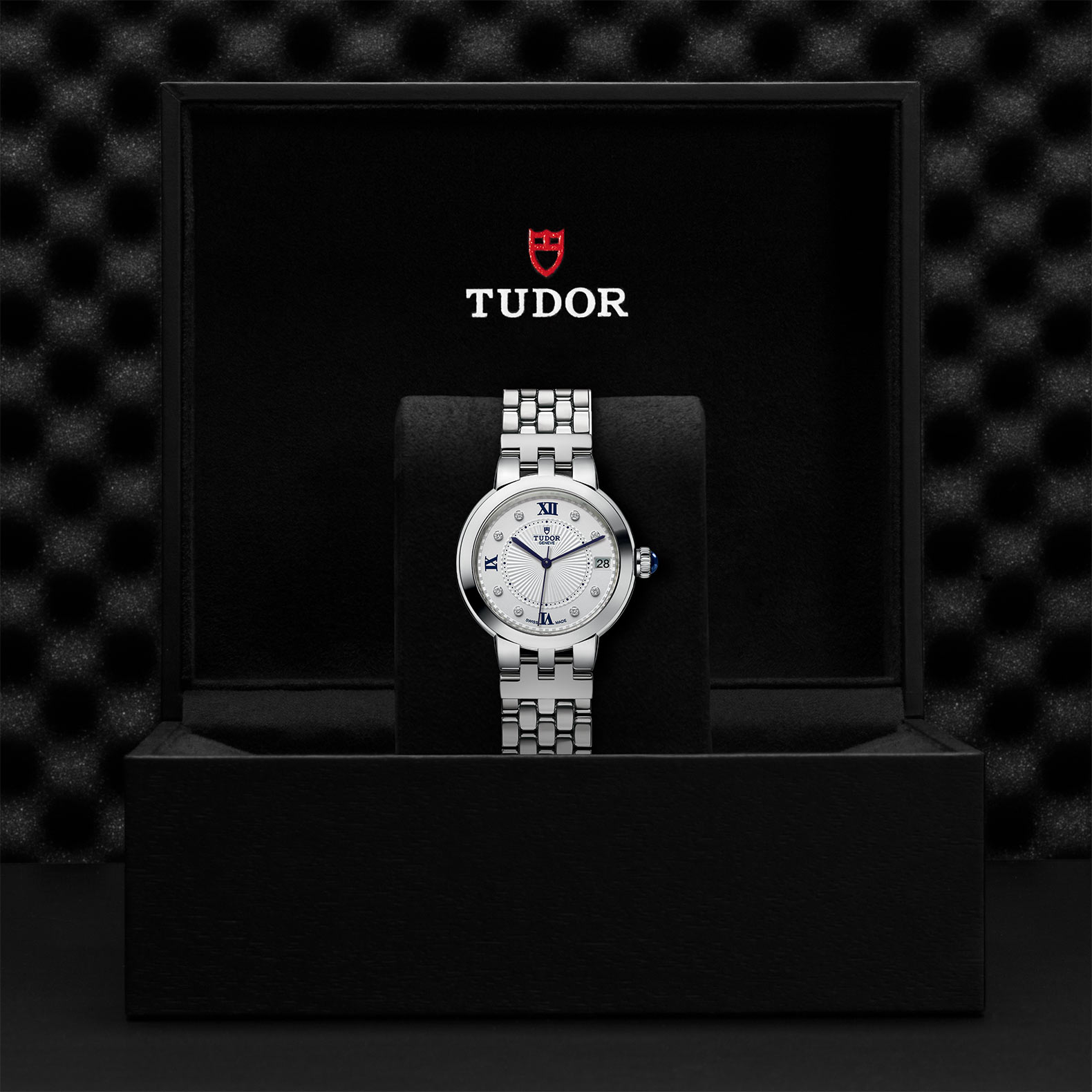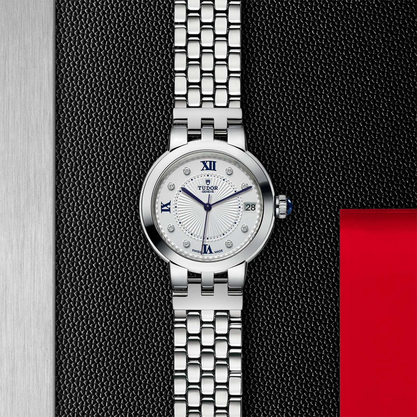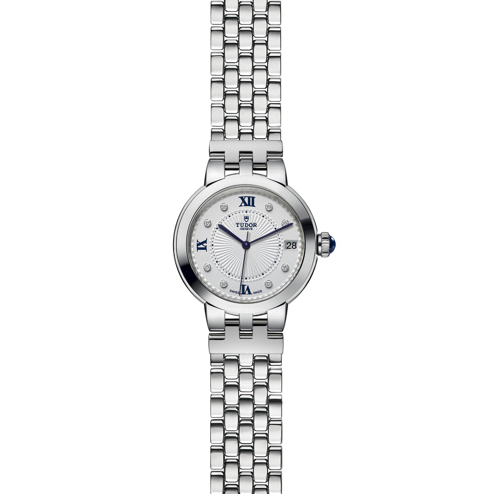 Bracciale in acciaio con chiusura pieghevole e fermaglio di sicurezza Elementi di giunzione in acciaio, Cassa in acciaio, 34 mm, finitura lucida, Opalino con 8 diamanti, Corona di carica a vite in acciaio con cabochon blu trasparente, Impermeabile fino a 100 m, Lunetta liscia in acciaio, finitura lucida, acciaio, Movimento meccanico a carica automatica, Calibro T601, Quadrante chiaro, Piccolo, Vetro zaffiro bombato