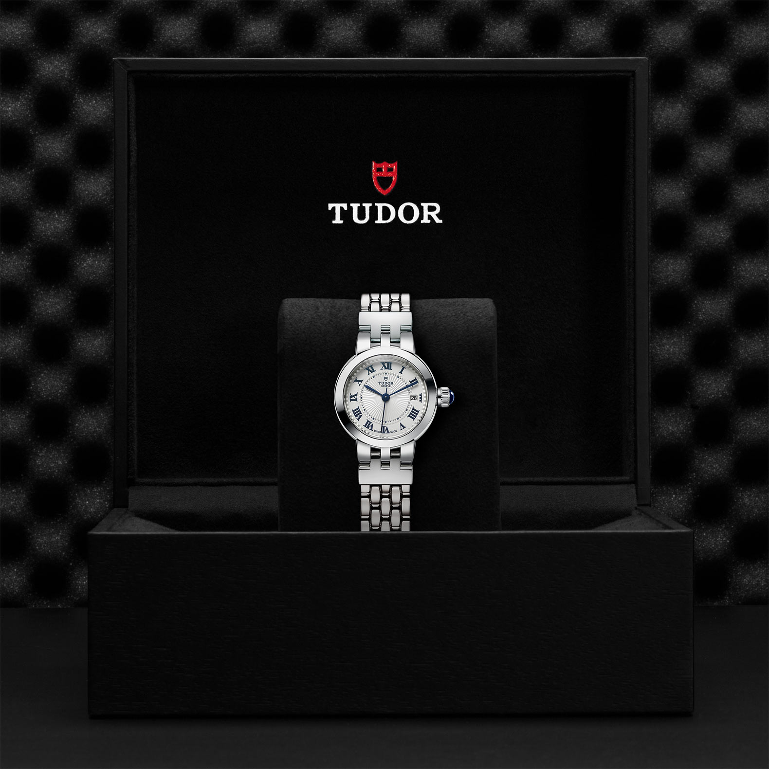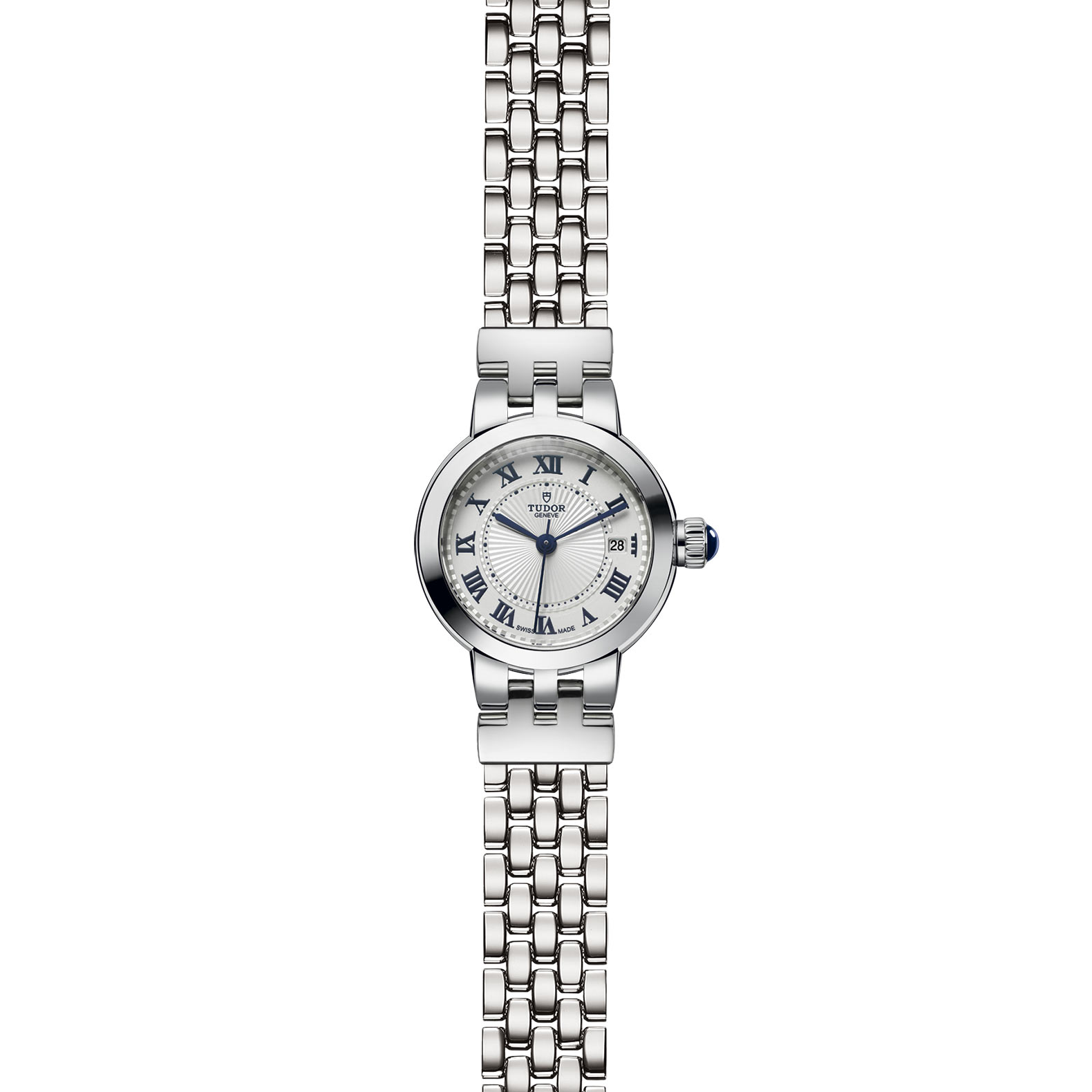 Bracciale in acciaio con chiusura pieghevole e fermaglio di sicurezza Elementi di giunzione in acciaio, Cassa in acciaio, 26 mm, finitura lucida, Opalino, Corona di carica a vite in acciaio con cabochon blu trasparente, Impermeabile fino a 100 m, Lunetta liscia in acciaio, finitura lucida, acciaio, Movimento meccanico a carica automatica, Calibro T201, Quadrante chiaro, Piccolo, Vetro zaffiro bombato