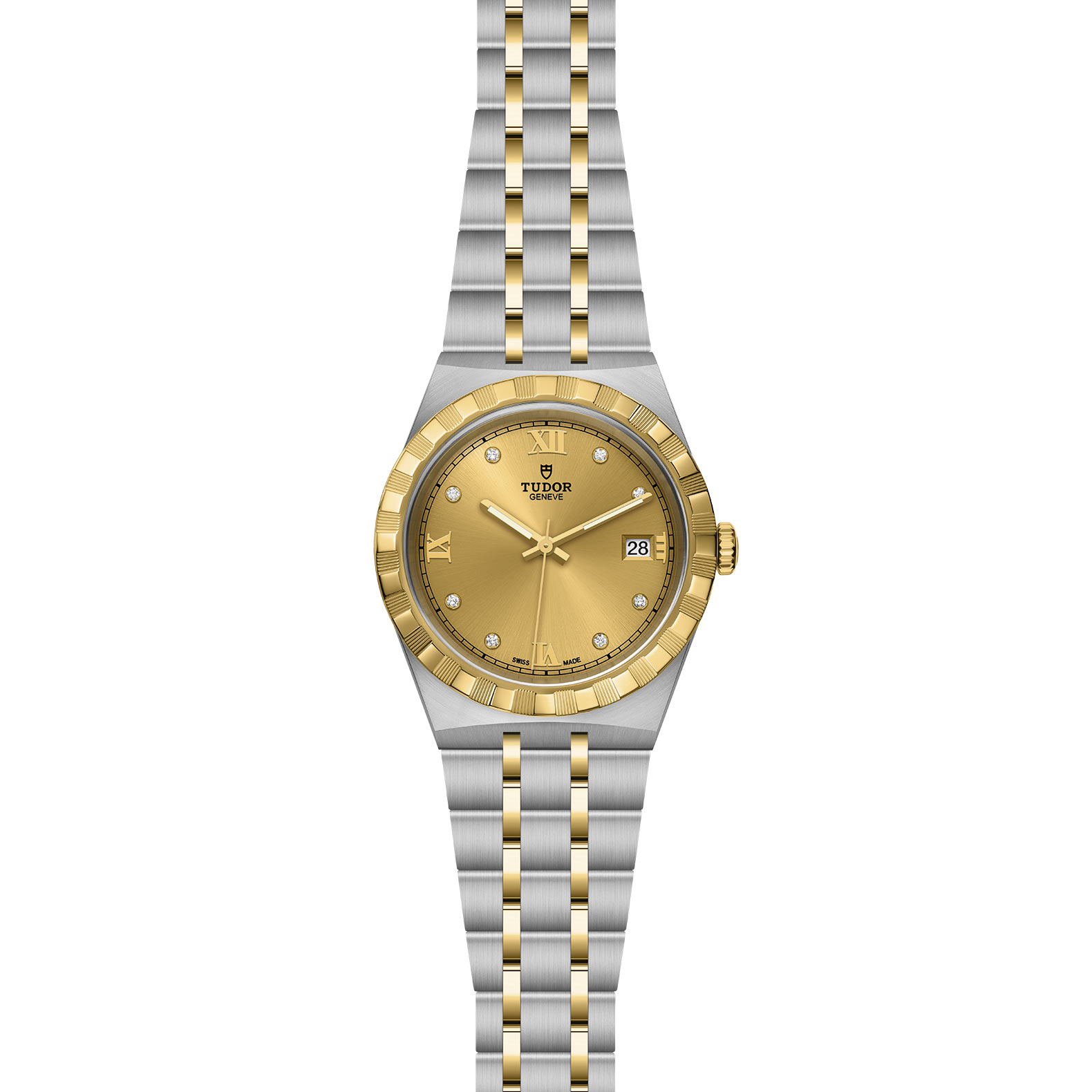 Maglie centrali in acciaio o acciaio rivestito da uno strato di oro giallo di 0,2 mm, Cassa in acciaio, 38 mm, finitura lucida e satinata, Color champagne, finitura soleil, con diamanti, Corona di carica a vite in oro giallo con logo TUDOR, Impermeabile fino a 100 m, Lunetta scanalata in oro giallo con scanalature e finitura lucida alternate, acciaio e oro, Movimento meccanico a carica automatica, Calibro T601, Quadrante colorato, Medio, Vetro zaffiro
