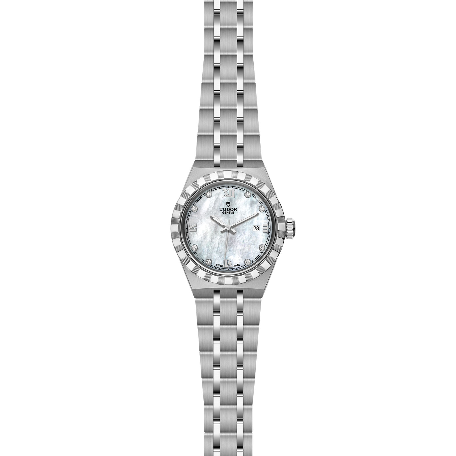 Bracciale integrato in acciaio, 5 file, maglie esterne e centrali satinate, maglie intermedie lucide, con chiusura pieghevole e fermaglio di sicurezza, Cassa in acciaio, 28 mm, finitura lucida e satinata, Madreperla bianca con pietre preziose, Corona di carica a vite in acciaio decorata con il logo TUDOR in rilievo, Impermeabile fino a 100 m, Lunetta scanalata in acciaio con scanalature e finitura lucida alternate, acciaio, Movimento meccanico a carica automatica, Calibro T201, Quadrante colorato, Piccolo, Vetro zaffiro