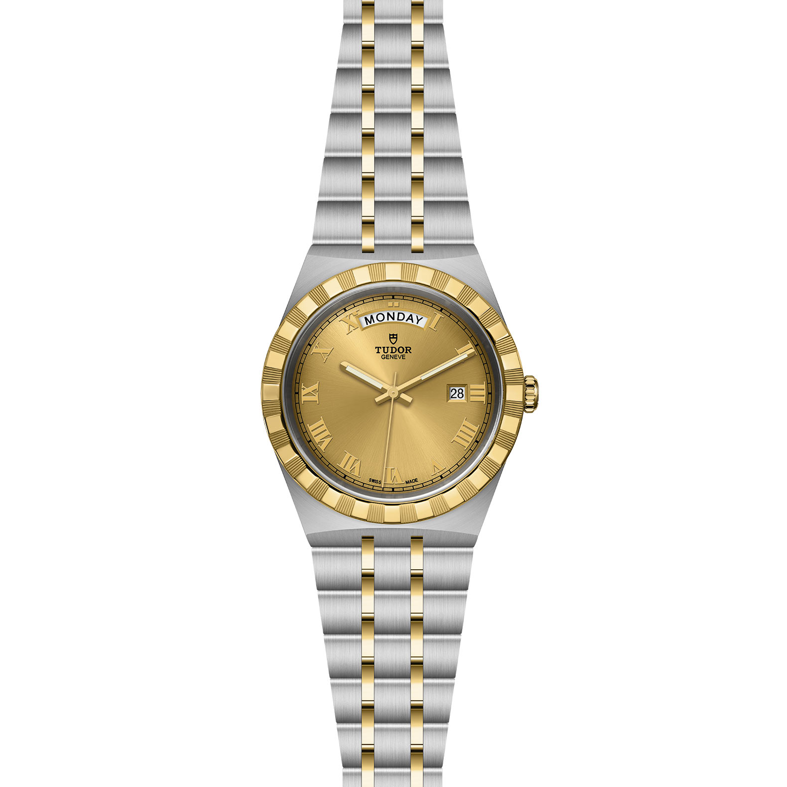 Maglie centrali in acciaio o acciaio rivestito da uno strato di oro giallo di 0,2 mm, Cassa in acciaio, 41 mm, finitura lucida e satinata, Color champagne, Corona di carica a vite in oro giallo con logo TUDOR, Impermeabile fino a 100 m, Lunetta scanalata in oro giallo con scanalature e finitura lucida alternate, acciaio e oro, Movimento meccanico a carica automatica, Calibro T603, Quadrante colorato, grande, Vetro zaffiro