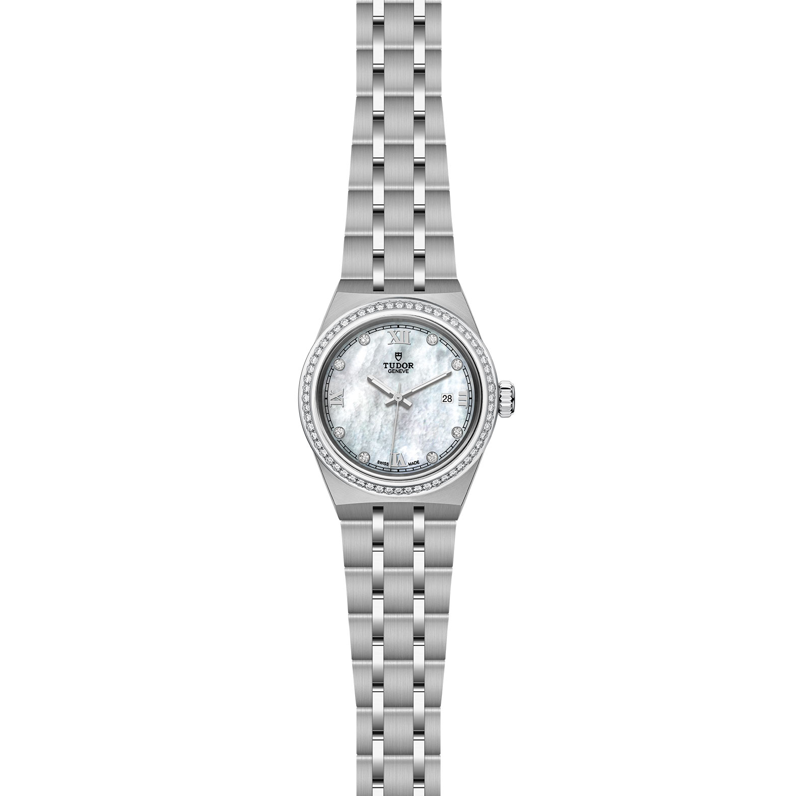 Bracciale integrato in acciaio, 5 file, maglie esterne e centrali satinate, maglie intermedie lucide, con chiusura pieghevole e fermaglio di sicurezza, Cassa in acciaio, 28 mm, finitura lucida e satinata, Madreperla bianca con pietre preziose, Corona di carica a vite in acciaio con logo TUDOR, Impermeabile fino a 100 m, Lunetta in acciaio con 60 diamanti, acciaio, Movimento meccanico a carica automatica, Calibro T201, Quadrante colorato, Piccolo, Vetro zaffiro