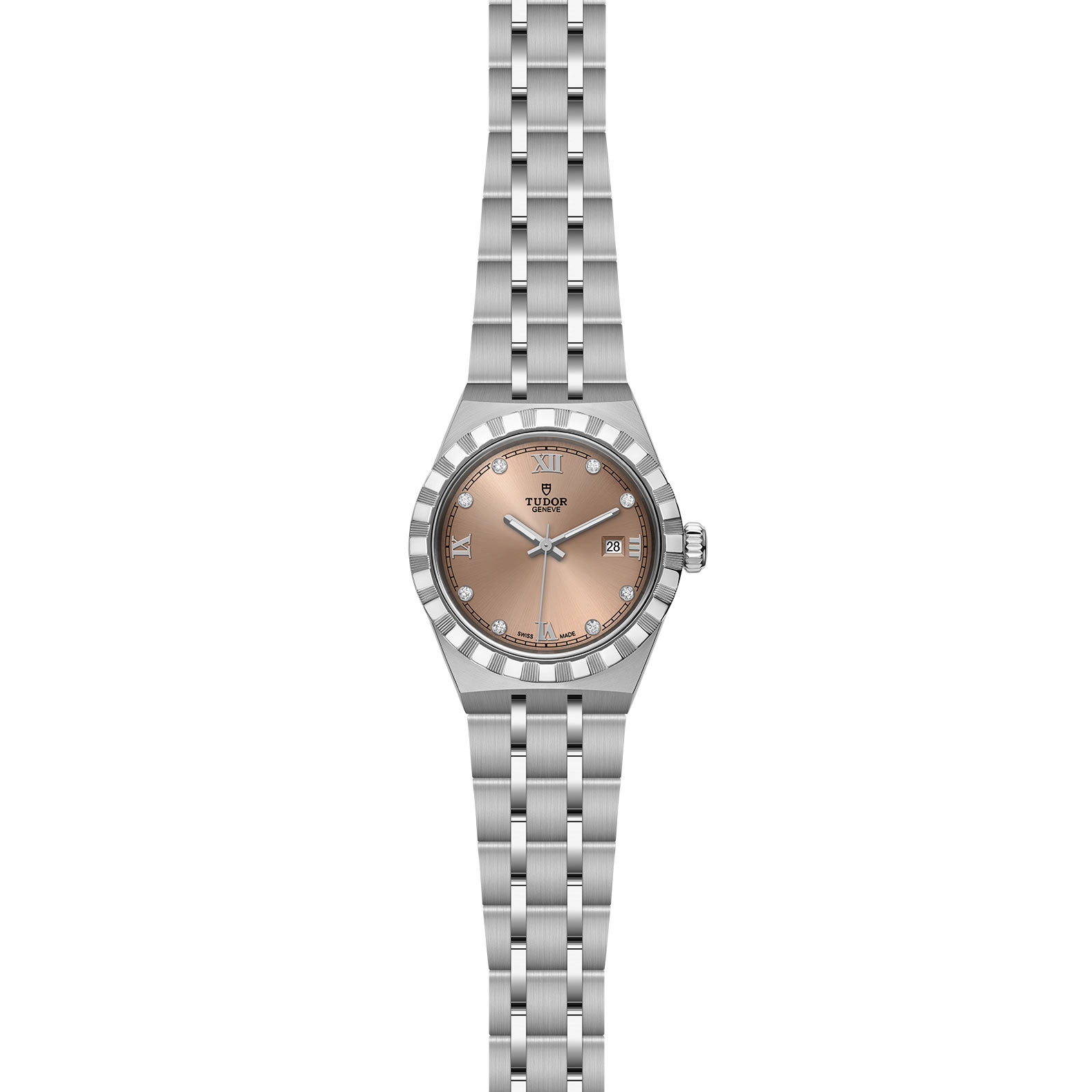 Bracciale integrato in acciaio, 5 file, maglie esterne e centrali satinate, maglie intermedie lucide, con chiusura pieghevole e fermaglio di sicurezza, Cassa in acciaio, 28 mm, finitura lucida e satinata, Color salmone con 8 diamanti, Corona di carica a vite in acciaio decorata con il logo TUDOR in rilievo, Impermeabile fino a 100 m, Lunetta scanalata in acciaio con scanalature e finitura lucida alternate, acciaio, Movimento meccanico a carica automatica, Calibro T201, Quadrante colorato, Piccolo, Vetro zaffiro