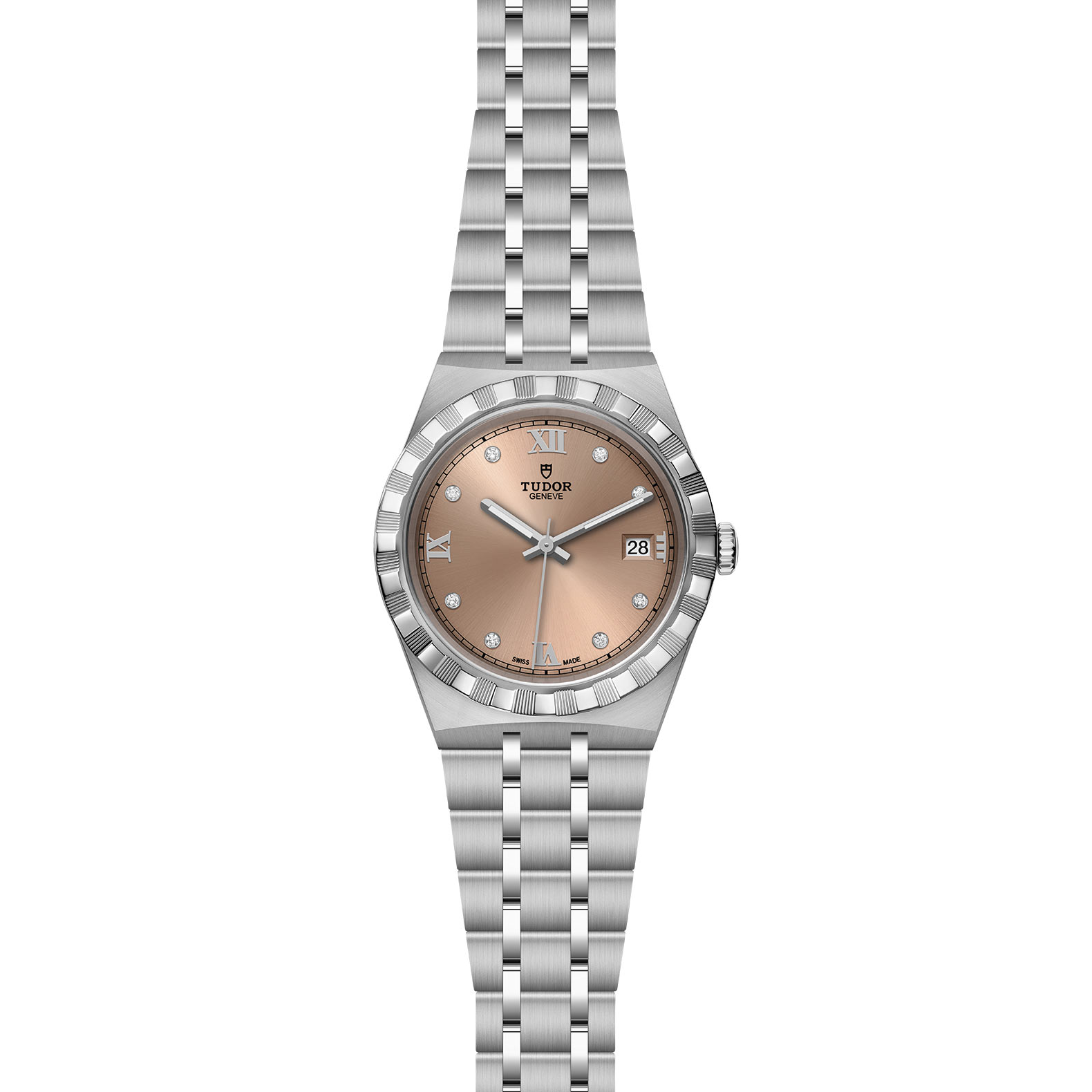 Bracciale integrato in acciaio, 5 file, maglie esterne e centrali satinate, maglie intermedie lucide, con chiusura pieghevole e fermaglio di sicurezza, Cassa in acciaio, 38 mm, finitura lucida e satinata, Color salmone con 8 diamanti, Corona di carica a vite in acciaio con logo TUDOR, Impermeabile fino a 100 m, Lunetta scanalata in acciaio con scanalature e finitura lucida alternate, acciaio, Movimento meccanico a carica automatica, Calibro T601, Quadrante colorato, Medio, Vetro zaffiro