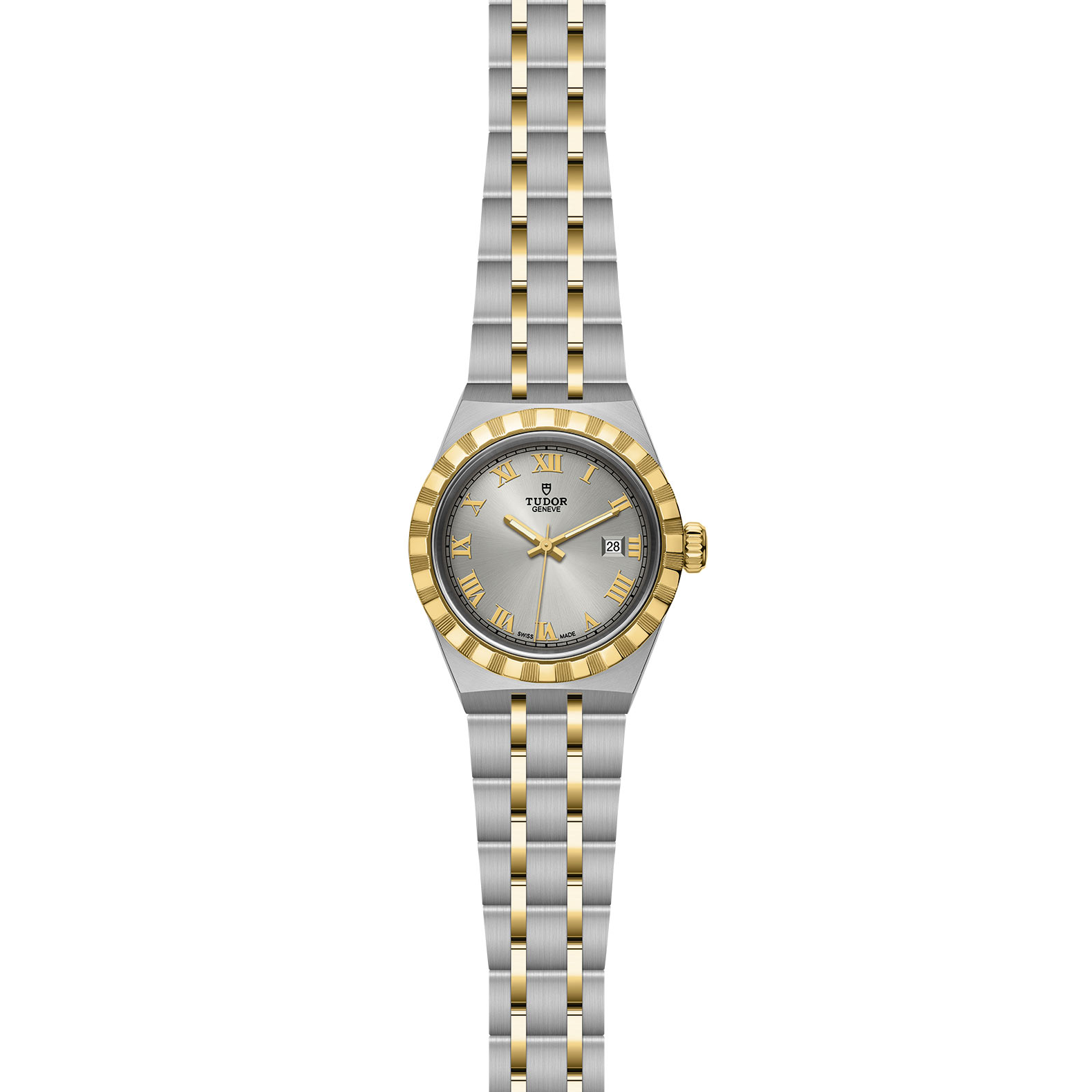 Maglie centrali in acciaio o acciaio rivestito da uno strato di oro giallo di 0,2 mm, Cassa in acciaio, 28 mm, finitura lucida e satinata, Argentato, finitura soleil, Corona di carica a vite in oro giallo con logo TUDOR, Impermeabile fino a 100 m, Lunetta scanalata in oro giallo con scanalature e finitura lucida alternate, acciaio e oro, Movimento meccanico a carica automatica, Calibro T201, Quadrante chiaro, Piccolo, Vetro zaffiro